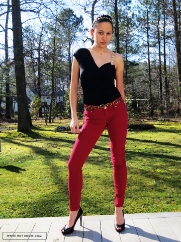 Misty Knight was a different case (even if I did use the same shoes).  When Lin and I first decided to do outfits to celebrate the release of Fearless Defenders, I immediately grabbed for my tight red jeans because if that doesn’t scream Misty, I don’t know what does.  The top took a little bit more thought as did an outfit for Misty in general.  Going all red would be too literal of a translation so I instead opted for an asymmetrical black top with gold accents.  The asymmetry was the best way I could think of to make a nod towards her bionic arm.