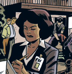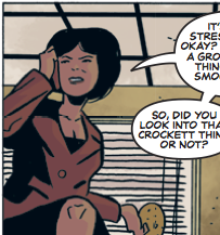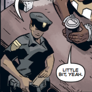 Molly’s design was all Scott. Looking back on it, we actually bolded it when the cops come in and call her “Officer Harrison” as the tipoff, but we probably didn’t need to bother. It wasn’t meant to be a big secret or a shocking reveal, but we really liked the idea of Molly starting off a disillusioned fan, someone who really liked Chuck but then kind of turned on him after she found out what happened at the big playoff game brawl and saw him as just a crook, before coming back around to being on his side. I think if you’re paying attention, it adds a little something to her pursuit of him, in that she feels guilty about being starstruck when she had him in the station the first time around, but the more she learns about him, the more she realizes he’s actually a decent person.
