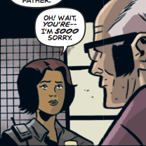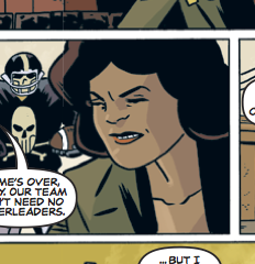 That was another line where we wanted to make it clear that, at that point, she really didn’t understand Chuck’s motivation. When she says that, she doesn’t have the full picture, she just knows him as this criminal athlete who got kicked out of the league under a cloud of controversy and was linked to gambling. From her point of view, he’s just this violent guy who was probably throwing games, you know? But for Chuck, that course of action makes perfect sense. As much as Al’s the one who pushes it into it, Chuck really does love the game, and it’s pretty clear from that first chapter that he’s good at it. He has a knowledge and understanding of it, and in a way, it’s the only thing he really knows, but he’s not a guy who hates football because of what happened to him. He’s a guy who keeps The Essential Vince Lombardi on his nightstand, you know? [I totally don’t know. But I get it. –CN] But if he can’t walk away from football itself, he can walk away from the big money world of professional sports that he was pushed into. It’s his big act of rebellion against Al. Not just walking away from the money, which is something Al would never understand, but also teaching children in a way that’s way more compassionate than we see Al “teaching” Chuck in the flashback scenes. But if you’re Molly and you don’t have the whole picture, if you’re not seeing the flashbacks and if all you know was that Chuck “sold out” his dad to avoid jail time, that’s not going to make a lot of sense to you.