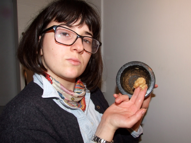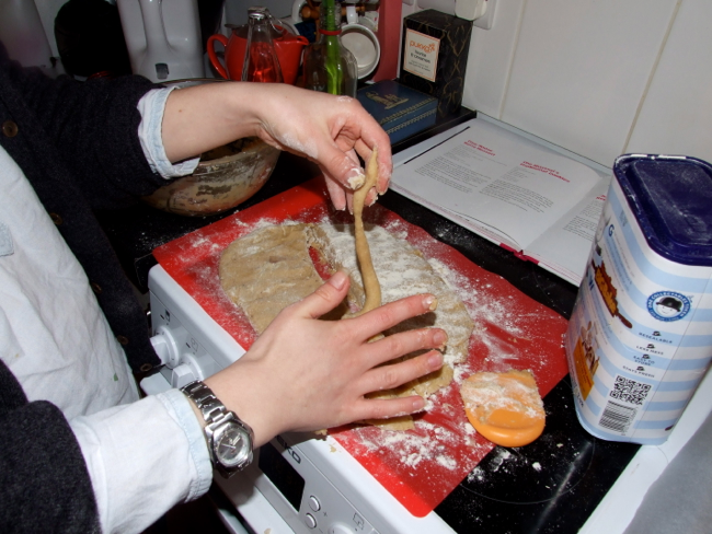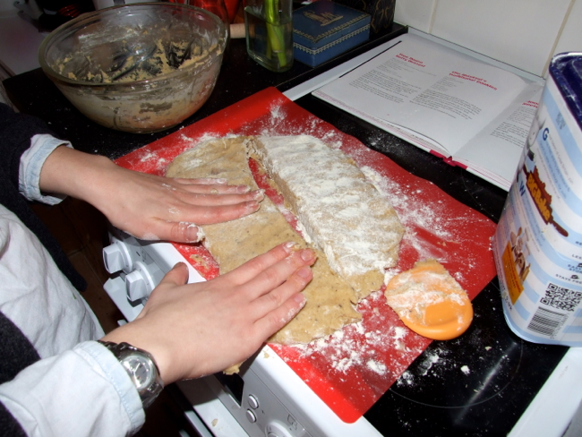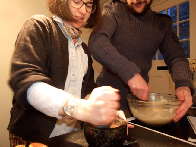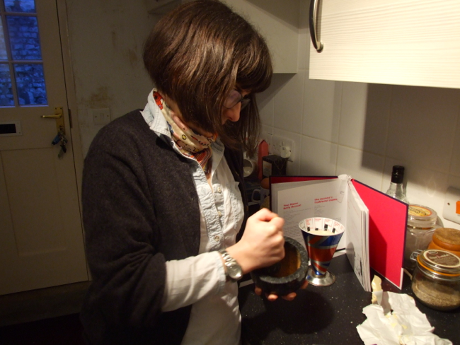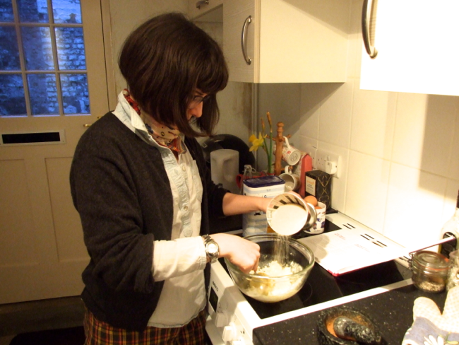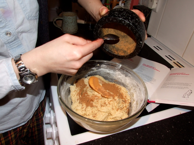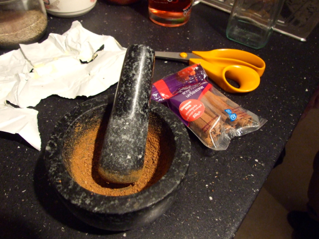 We didn’t have any ground cinnamon, which was a huge stumbling block! That’s the only flavouring agent! But I do have a pestle & mortar, and Mind, my Thai pen-pal, sent me some cinnamon sticks back in January… so it was clobbering time. Grinding your own cinnamon takes quite a while, and leaves you with small, manageable, but definitely present, lumps. These don’t matter, though, because it turns out the fresh cinnamon powder is sublime. An easy winner even against the best supermarket bottled options.