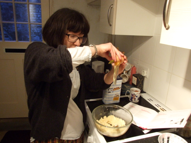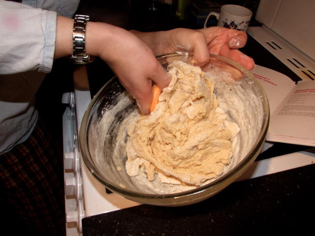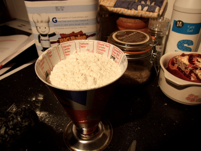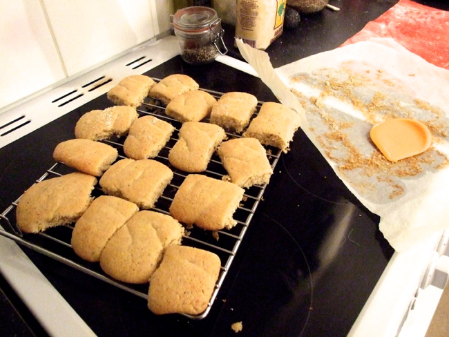 You need a bowl, a whisk, something to measure your ingredients in and enough surface area to roll your dough on, as well as a baking tray and grease-proof paper. Our paper went ungreased, because we ran out of butter and threw away the paper packaging before it could be rubbed over the tray, but the biscuits didn’t stick as much as you’d expect. They came off in one piece each. Plenty of crumbing, but crumbs to eat up are a bonus of home baking.