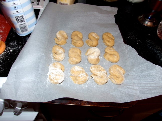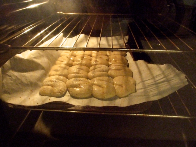 These biscuits are pretty strange. They’re very airy, cake-y, with a similar but softer texture to ladyfingers. I expected them to dry out overnight and go snapping-hard, but they did not. It’s pretty hard dough to handle, a lot wetter than expected, and I had to add several spoonfuls of flour more than the recipe suggested. Maybe my eggs were too big? I always buy large and the recipe doesn’t specify.