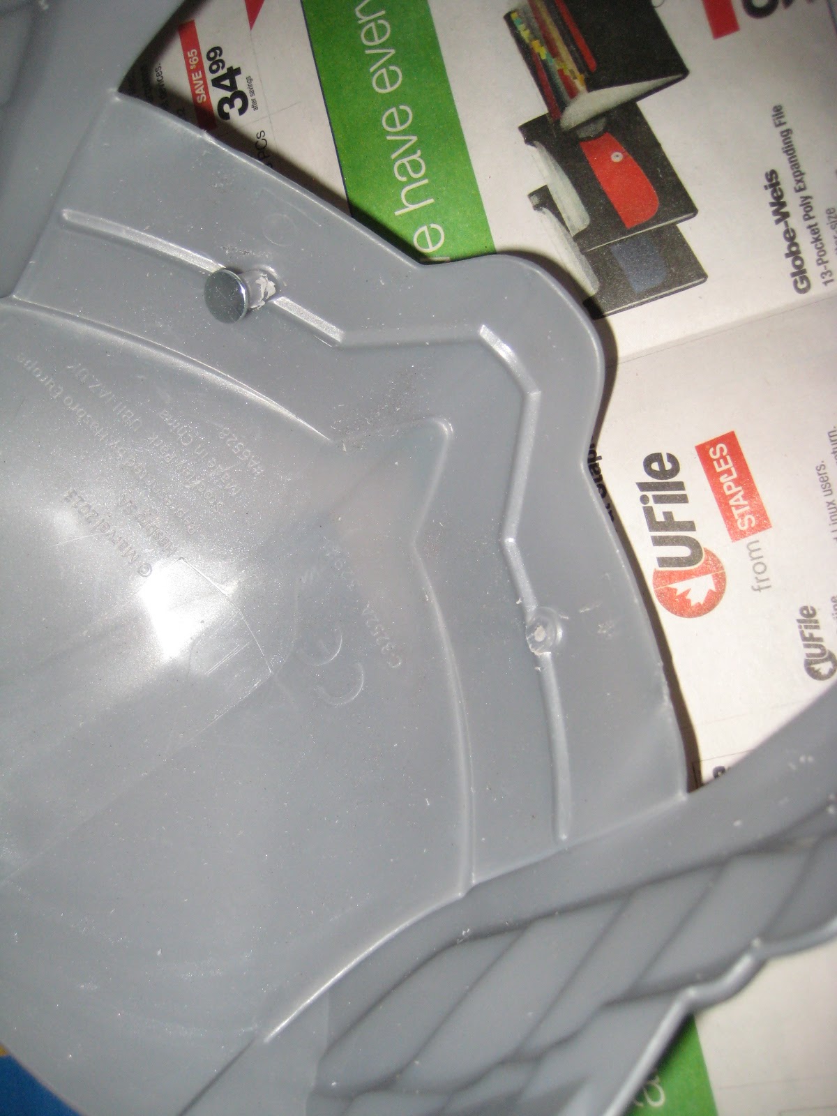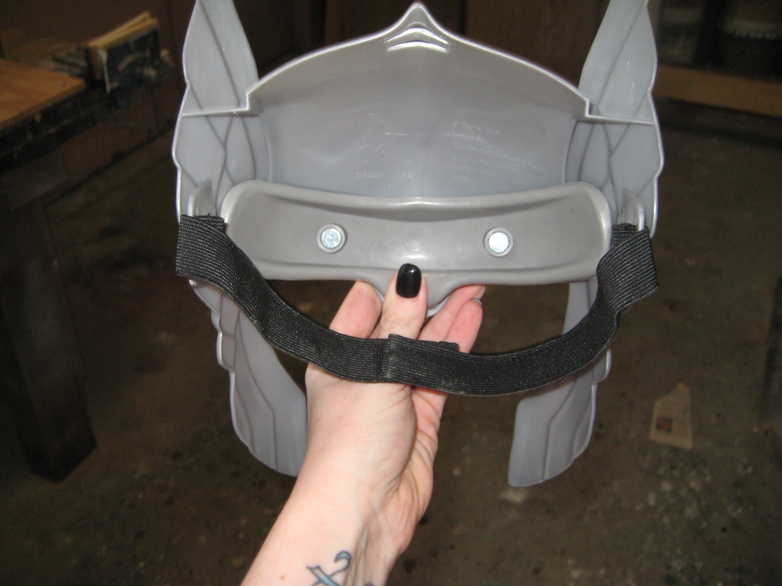 Inside the helmet there was this rubber forehead rest…thing. To be honest I wasn’t entirely sure what the purpose of this band was, but I wanted to get rid of it. So I got out my Dremel tool. The Dremel and I have a serious love/hate relationship, in that I really want to make it work but I’ve never really figured out how. In this case, though, Mr Dremel and I got along well enough to take off the plastic pegs that held the rubber piece in place.