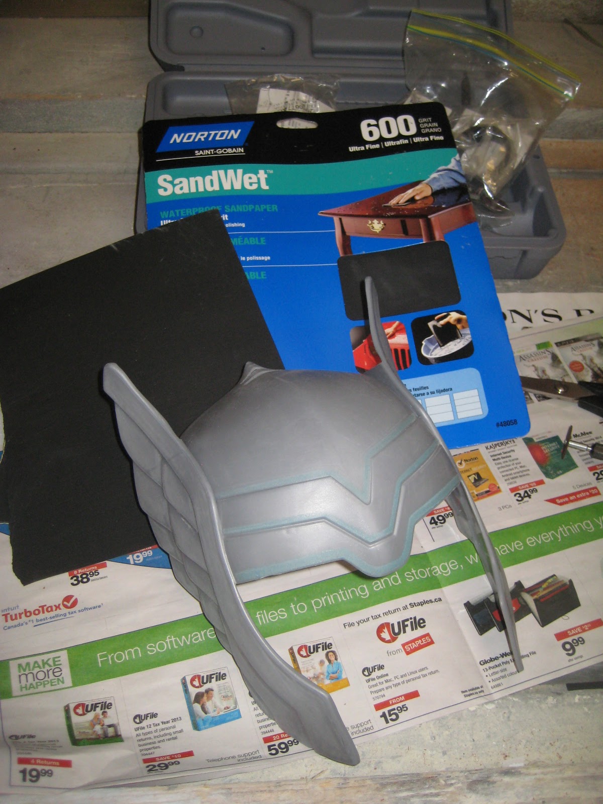 Here’s the store-bought kid’s mask I got at Toys R Us. Not too bad looking, except that the stripes at the front glow in the dark. I’m fairly certain the son of Odin doesn’t glow in the dark, so that was going to have to change!