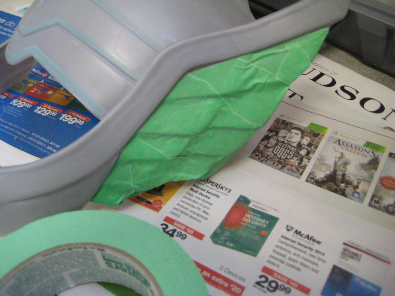 Once the entire surface of the helmet was sanded, including the “wings”, I taped that area off with masking tape. I needed the bare plastic there in order to glue on feathers later, and I was worried the spray paint would just make the glue peel off. It was probably an unnecessary step but I wanted to be sure everything was prepared properly!