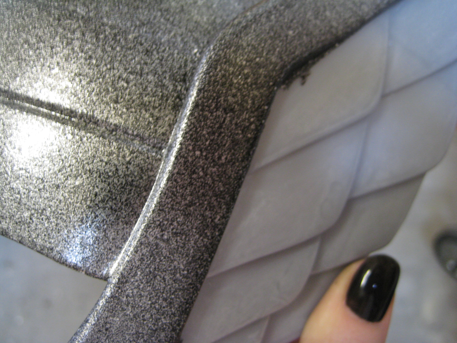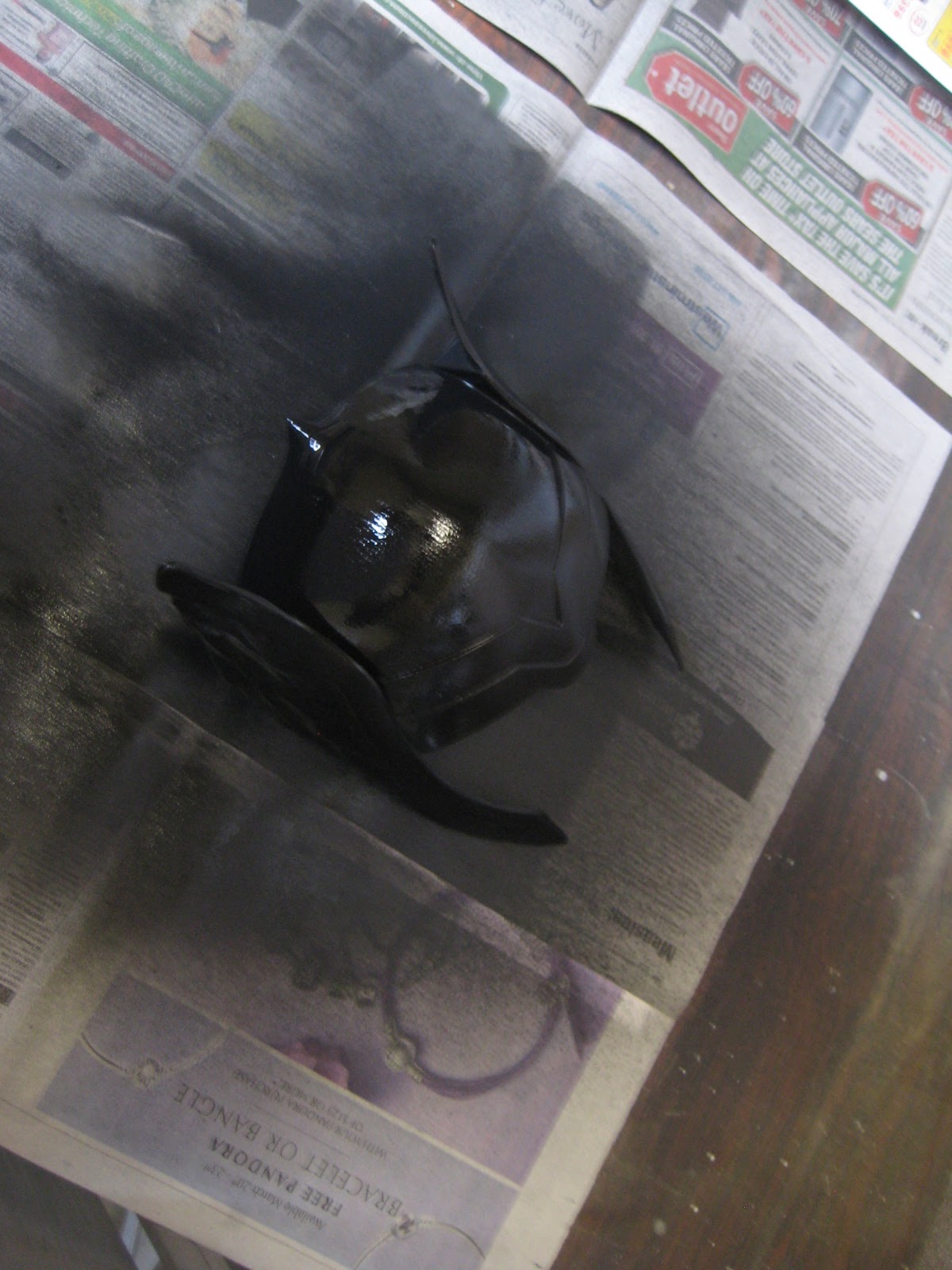 Before I started the metallic effect on the helmet, I sprayed the whole thing with a coat of black primer. I didn’t even know such a thing existed, so when the guy at the craft store showed it to me I was over the moon! It really made a great base for the finish I wanted to do. For the record, I can’t honestly remember where I learned how to do this paint effect. I used to do faux-finishing and home painting for a living and absorbed a host of techniques with no recollection of how or where, whether it was a colleague, a TV show, the internet or a book. But the effect is simple enough to do: you take silver spray paint, and give the item (in this case, my helmet, obviously) a thick coat of paint. Then, while it’s still wet, take black spray paint and “mist” it lightly over the silver. As it all dries together, you get a speckled, almost hand-forged effect.
