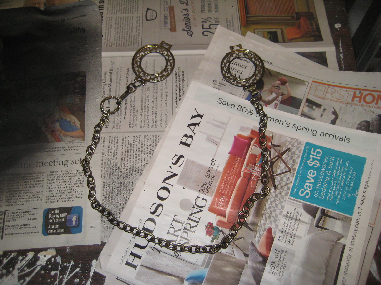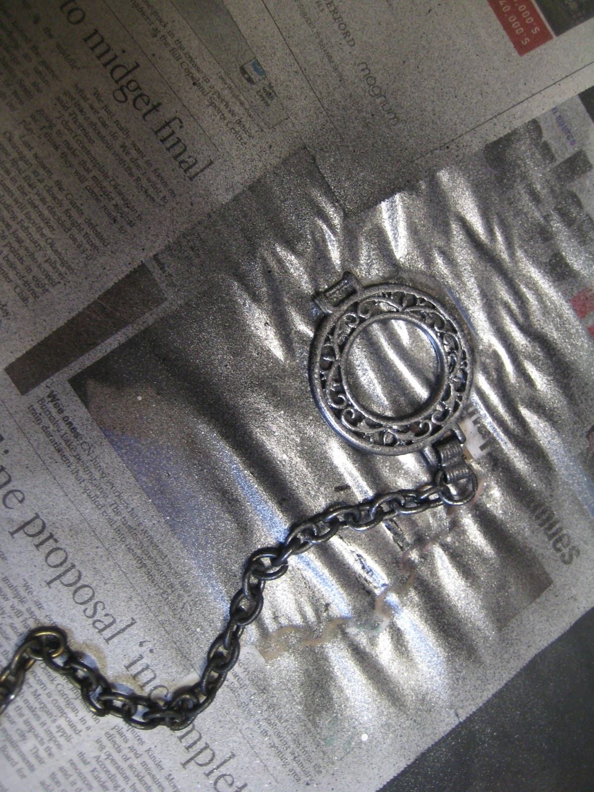 Unfortunately, I needed at least two more layers of Mod Podge before the logo would disappear completely, and I only had one day left before con! So I wracked my brain for a plan B: a while back I had found a funky 90s metal belt at Value Village (aka, costuming heaven). I had the intention of using it to create buckles for a cape on a Scarlet Witch costume (which I have yet to get done, naturally). I had already used pieces of the belt for a Chun Li Halloween costume and knew they were the solution to my issue.