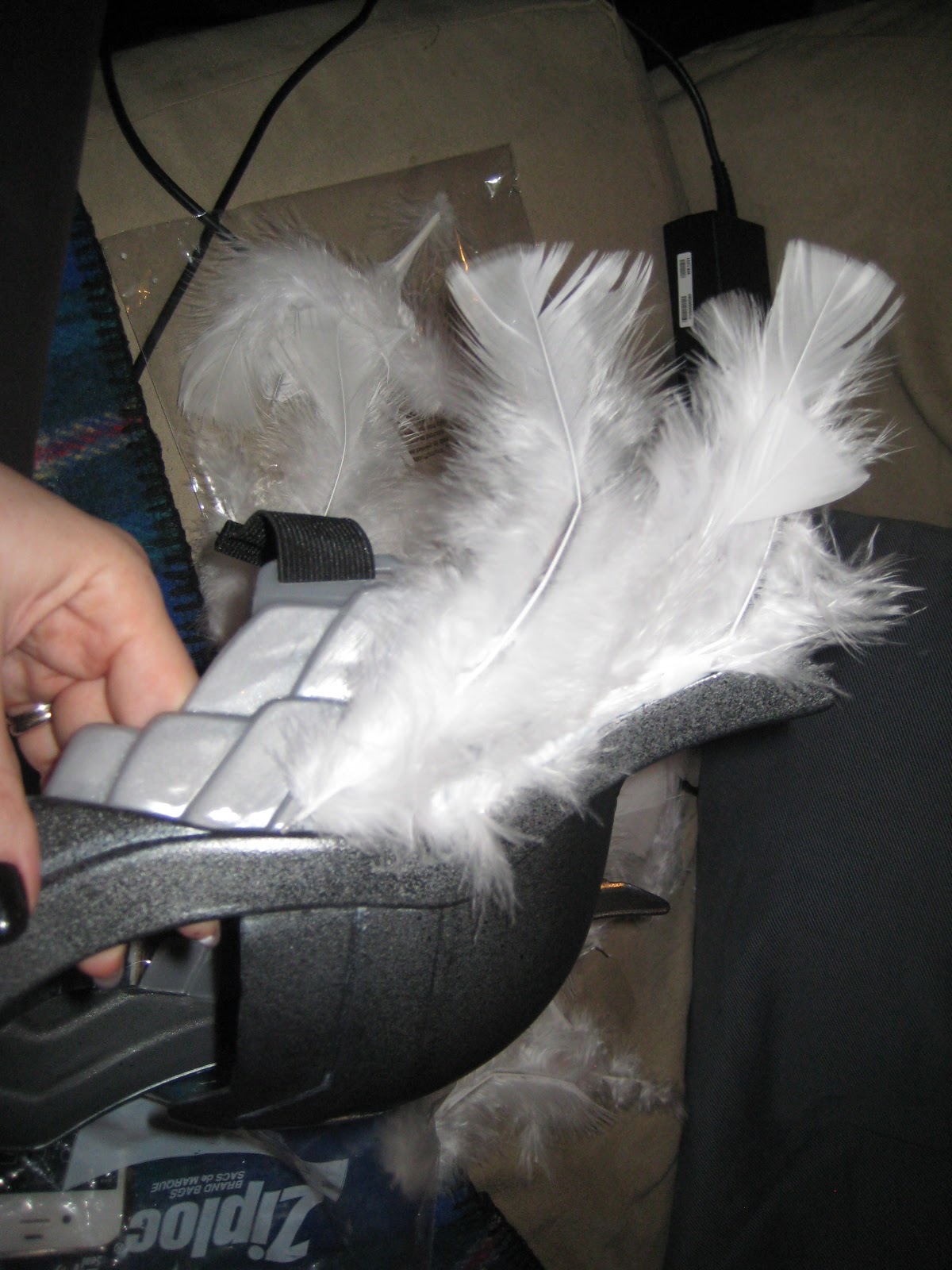 After letting the sealer dry overnight I started gluing the feathers onto the wing areas of the helmet. If you get nothing else from the article, I want everyone to know how awesome Mod Podge is. This stuff is amazing, you can use it for anything. You’ll see what I mean later on with the armour I tried to build. Incredible stuff for all crafts, but especially useful for cosplay!