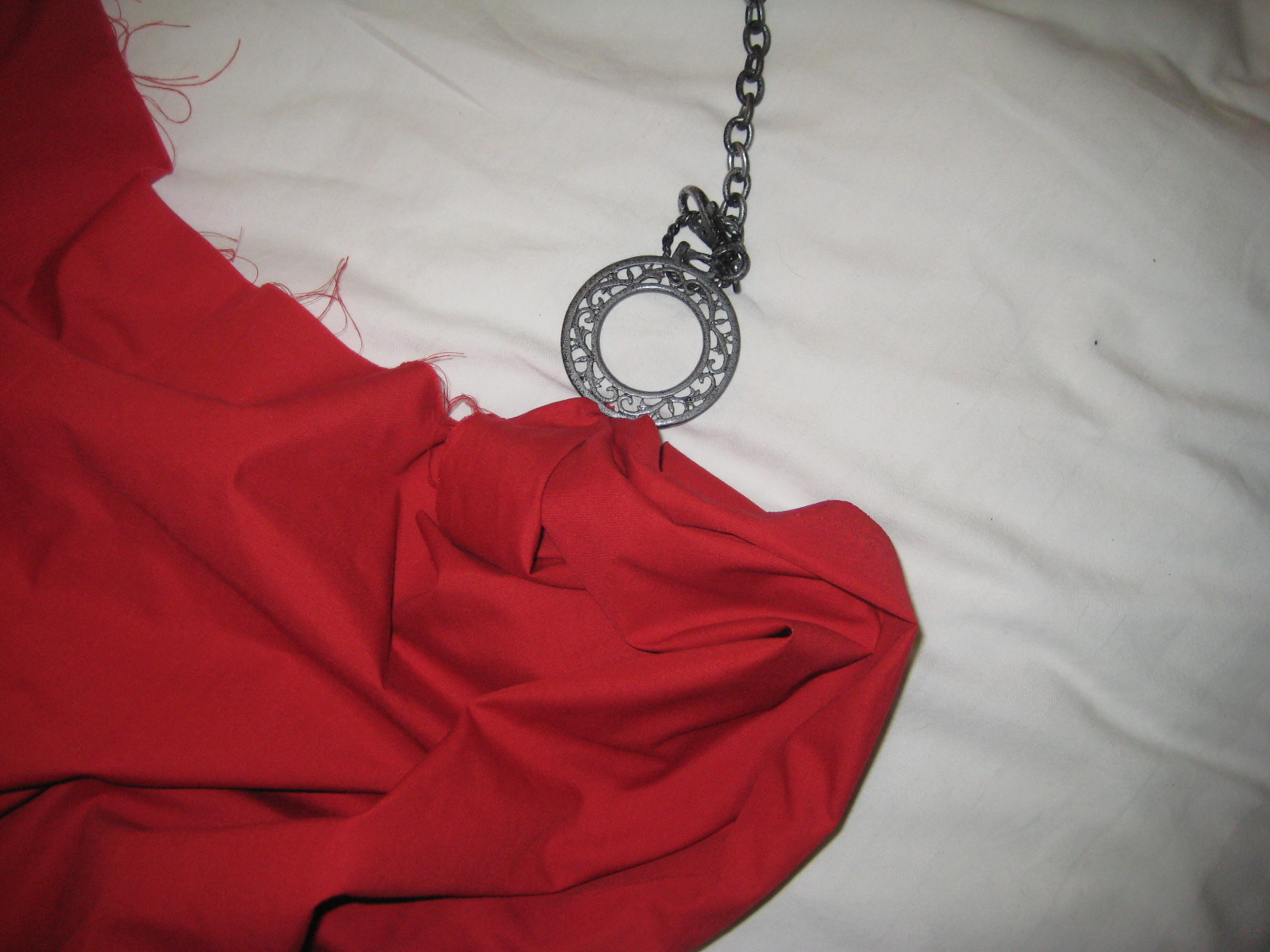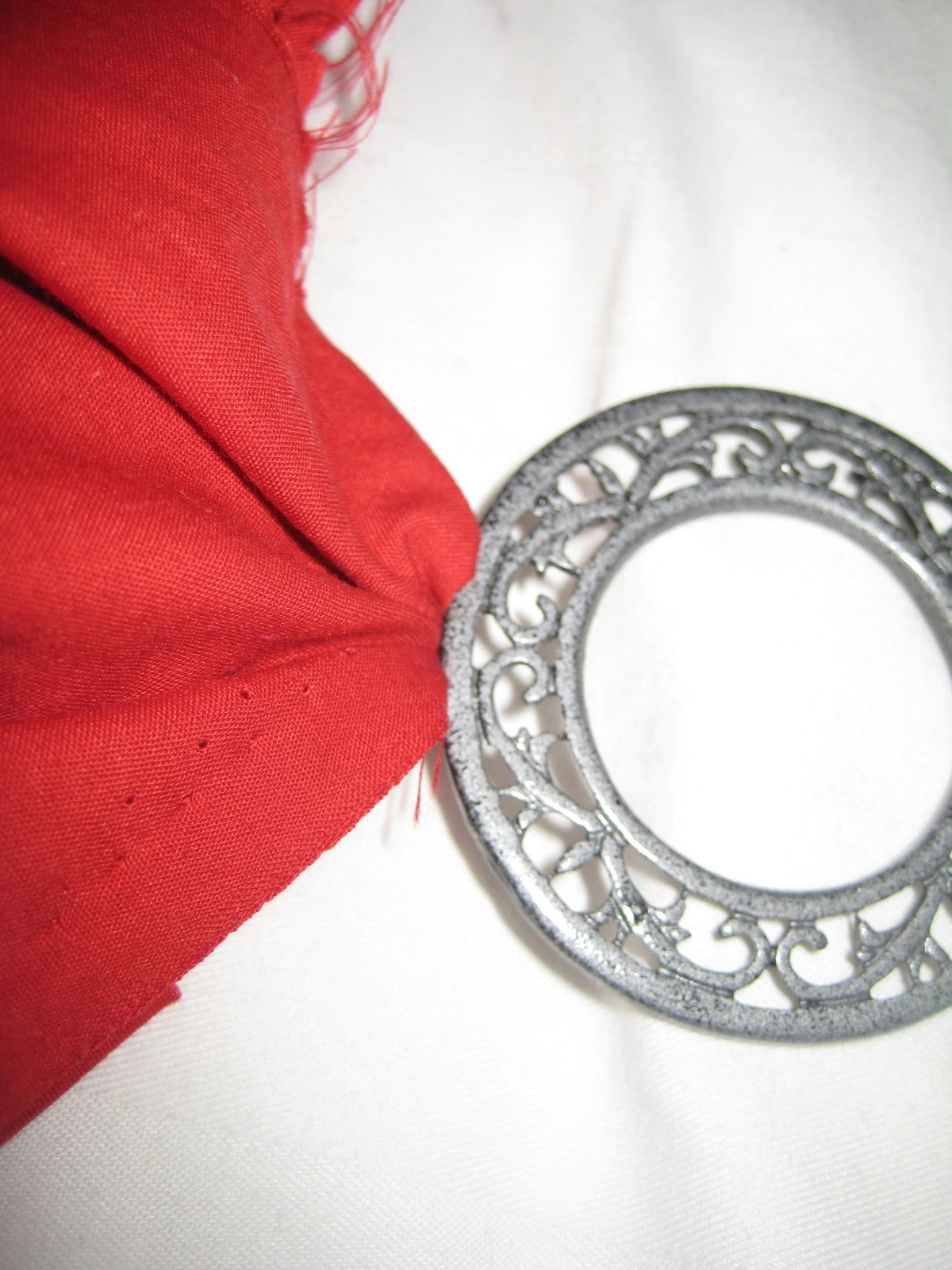 I tucked the corner of the fabric into the loop at the top of the disk, where a metal clasp used to link it to the next disk, and so on, back when it was a belt. I sewed it by hand (with help from my Nick Fury!) and left some “ruching” for dramatic effect!