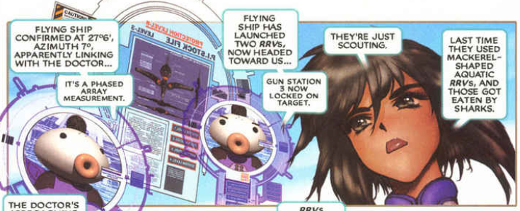 This comic has no trust. The previous manga featured a footnote explanation or two, but here they’re prevalent. Perhaps it’s a very poor translation job — perhaps, but exposition is passionless to the point that it feels pasteurised. Why? Does Shirow not trust his craft? Does he mistrust his audience?