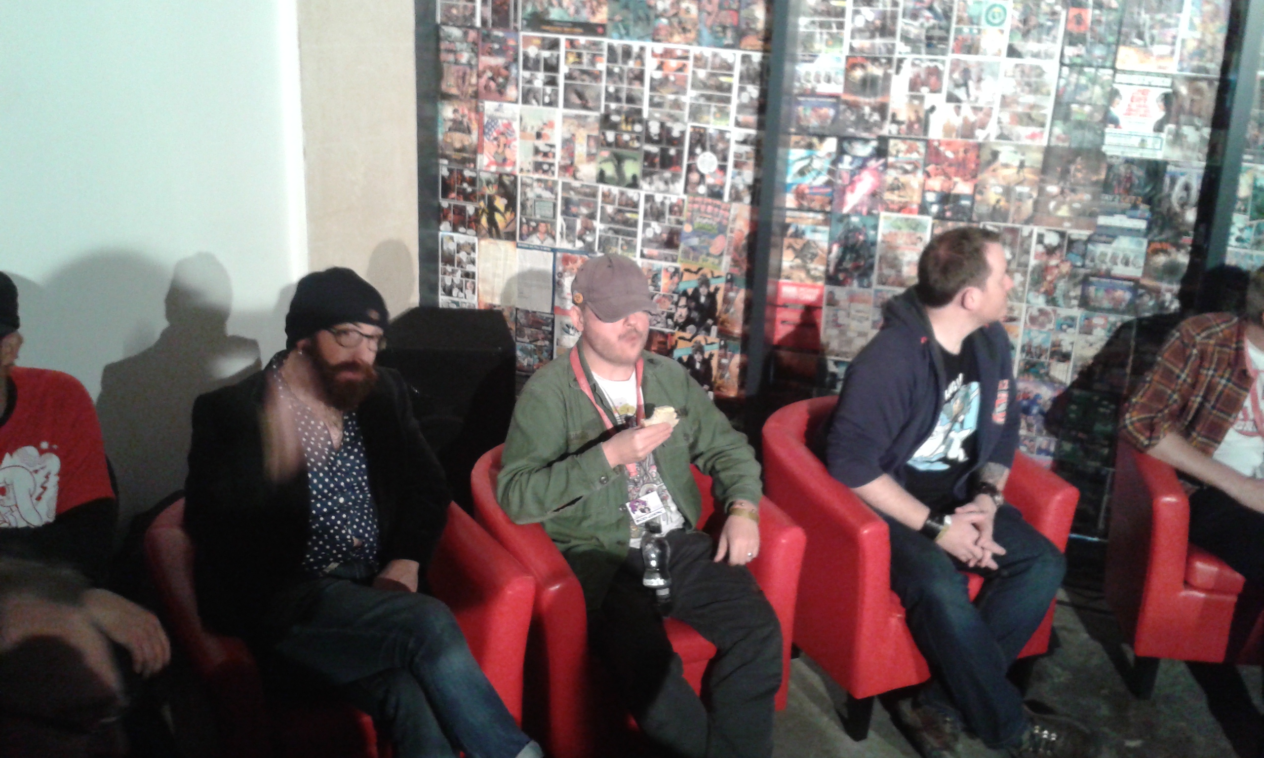 I’d already decided that today would be a 2000AD day, so I then headed to a screening of Future Shock, a documentary on the magazine’s history. The movie was well put together and didn’t shy away from incidents that portrayed the publication in a less than favorable light. For instance, former editor David Bishop angrily recalled sexist ads created and disseminated by their managing company (despite his protests) which used the tagline “Women just don’t get it.” The main reaction from the Thought Bubble audience was an audible gasp of horror. That, I thought, was a good sign. If the attendees didn’t just recognize that the ads were unacceptable but actively found them upsetting, then it was more likely that they supported gender equality in comics fandom and creation. The only problem with the screening was that the film kept freezing and skipping. I suspect this was a loading issue rather than a problem with the movie itself, but for future screenings, I hope the Thought Bubble organizers will fix similar issues as soon as they can.