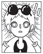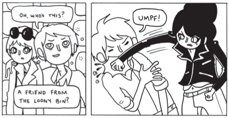If there was a third panel between “Loony bin” and “umph,” showing Bon-Bon’s expression changing, or the punch beginning its wind-up, this scene would be so different. It would be vengeful and satisfying. We’d get a mirror neuron buzz from seeing these characters’ emotional chemistry bubbling up in response to sexist bullying. It would be really much more Kill Your Boyfriend. But it’s not! Bam, Bon-Bon makes him stop, because there is no time in this world for that nonsense, and you’re (you, reader, are) not obliged to deal with it.