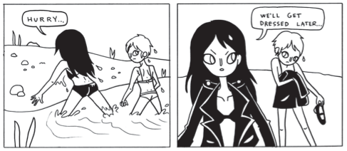 The new boyfriend, Killer Boyfriend, is exactly as poor a philosopher as our protagonist, adding his own personal negative by having the self-determination to bully, but not enough to set a non-oppressive course apart from “the norm.” It’s a particularly masculine over-egging of the violently nihilistic pudding you might call the boredom of privilege. Oh my gosh, reject this. Reject this so hard. Throw it into a great big incinerator and mix up the ashes with salt. This comic is just cruel losers thinking they’re #epic because they’ve given in to bullying those they perceive as weak, disbelieving that they themselves can ever choose to be strong. Too afraid to make a better world, they wet their pants all over this one. This comic is conventional.