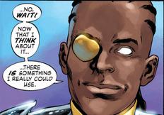 In his superheroic form, though, one of his eyes is missing. While this does entitle him to a cool golden eyepatch, it raises the question of how this will affect his superhero abilities. He joined the DC Universe as a Monitor back in Final Crisis, and is now “Nix Uotan, Superjudge;” in other words, his whole identity as a superhero depends on observation, which I imagine will be more difficult to navigate without his right eye. Also, since the right side is traditionally the side of favor or goodness, as opposed to the “sinister” left side, Nix is specifically missing his “good” eye.