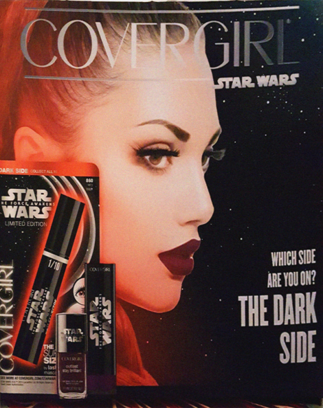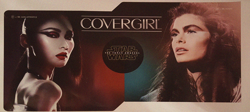 In not quite so new, but very compelling news — Covergirl cosmetics is releasing a Star Wars make-up line. There’s nothing official yet, but the Star Wars fan site Rebel Scum received some intriguing promotional images (see below). Additionally, the Covergirl website already has a page in the works for the line: www.covergirl.com/starwars. Reportedly designed by British designer Pat McGrath, named a most influential make-up artist by Vogue, the collection is aptly named “The Force Awakens” and will include a range of new shades reflecting both the Light Side and the Dark Side of the Force. The light side (named “The Light Within”) includes looks named “Droid,” “Sage,” and “Nomad,” while the dark side of the line (with the less imaginative moniker “The Dark Side”) includes “Apprentice,” “Chrome,” and “Storm Trooper.” There are apparently also collections for the Empress and Jedi, but I could not find any promotional images for those. Make-up available consists of lipsticks, nail polish, and a whole lotta mascaras. Covergirl is releasing 10-15 (sources vary on the number) mascaras, each with a Star Wars quote such as “You’re my only hope.” No word as to if the mascaras are all different colors, but methinks in this case it’s more about the packaging than the packaged. (A friendly reminder: mascara is really only good for about six months after you open it.) Notably, some of the packages include movie ticket discounts.