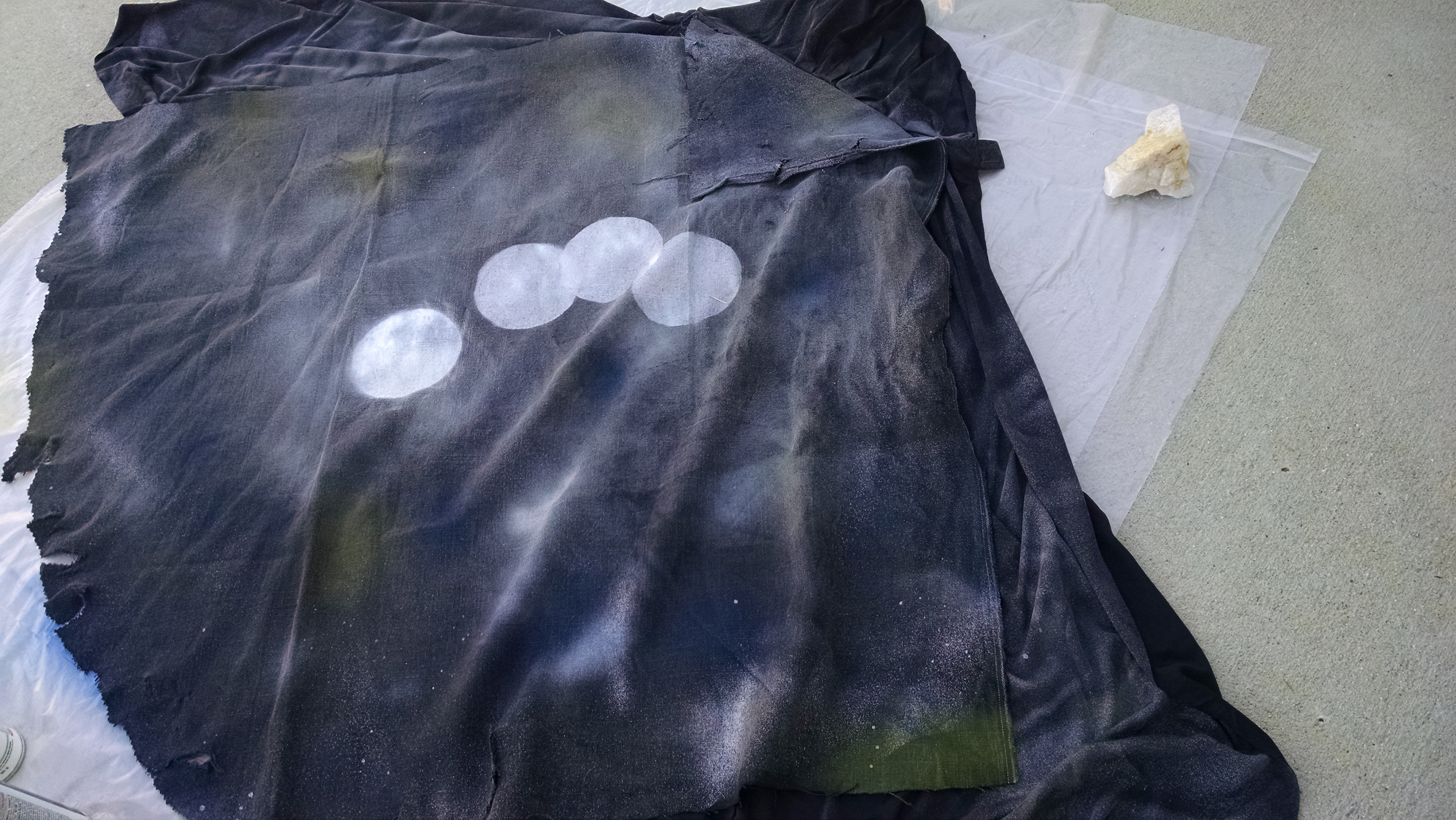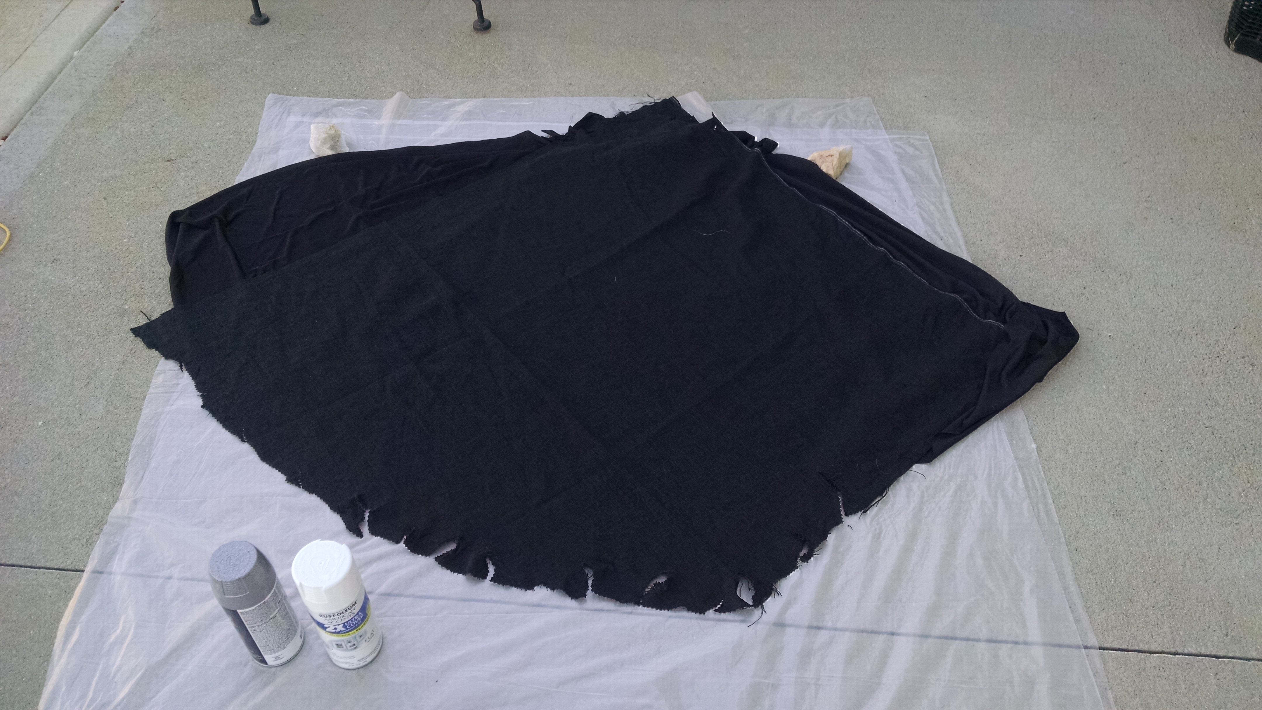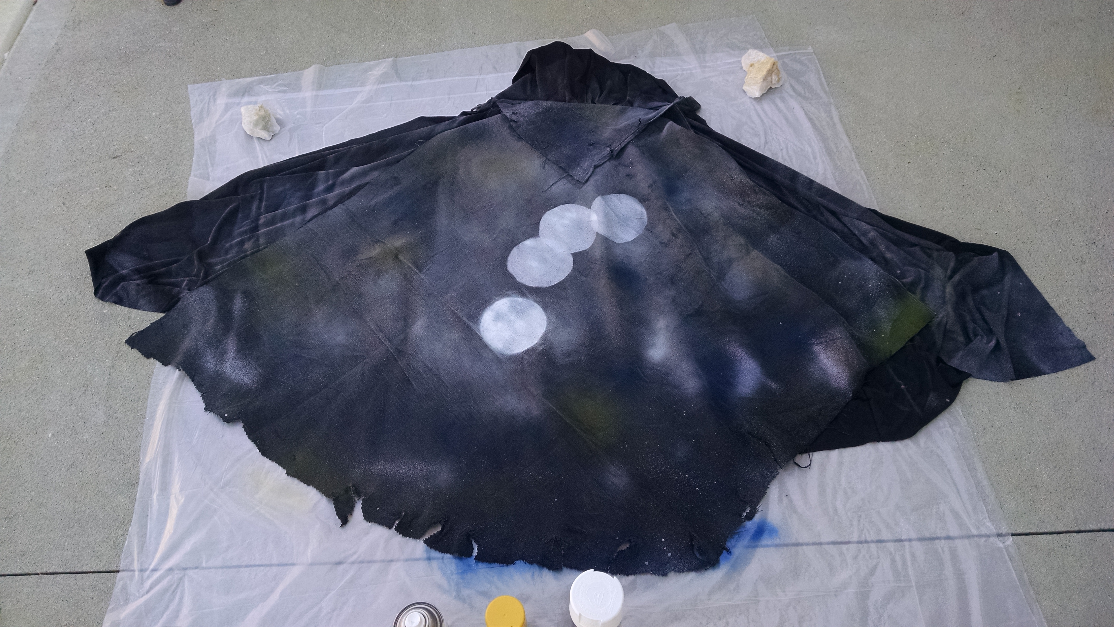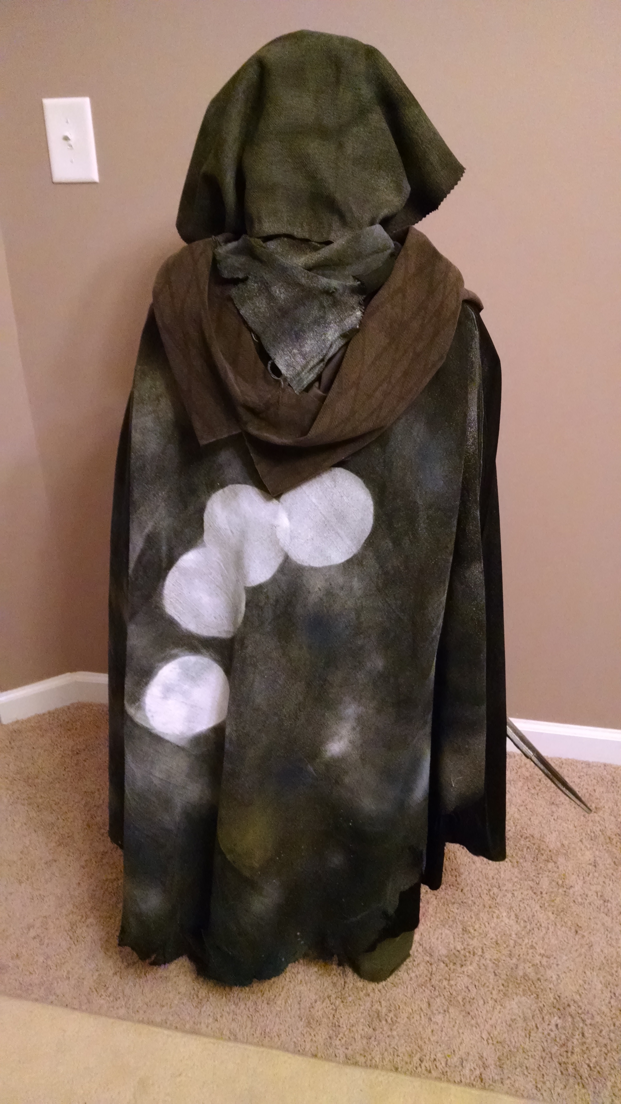 The first thing I tackled was the cloak. At our local Party City, I found a kid’s size vampire cloak, then sewed material over it to created a layered, ragged look. Using scissors, I cut and shredded the edges. There was no real guide for the cloak, I just looked at a lot of them online and then did what I thought worked best. After considering various established emblems, I realized it would be more interesting to create our own. Using a round paper cut-out and grey, white, blue, and yellow spraypaint, I created the Four Moons emblem.