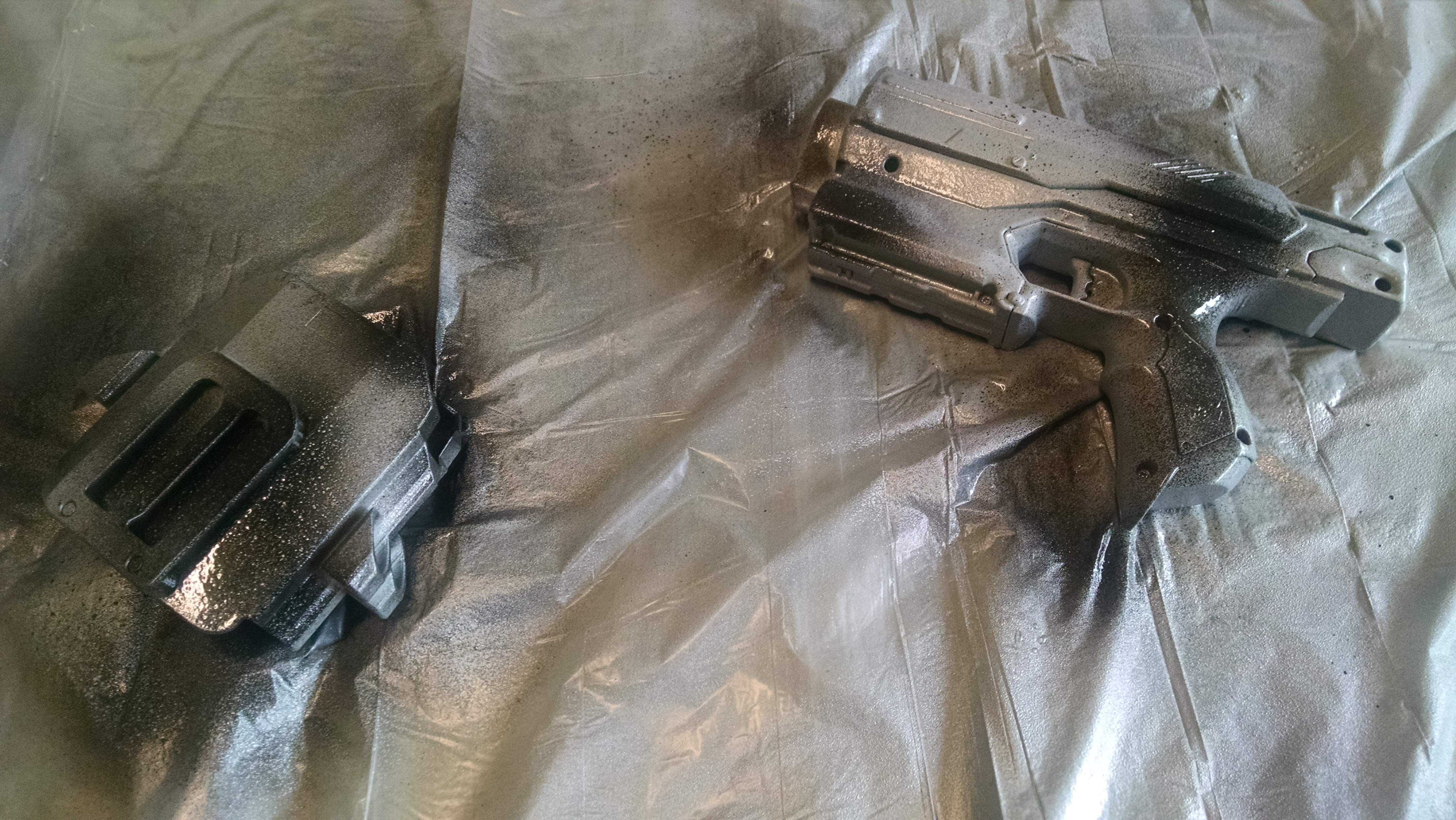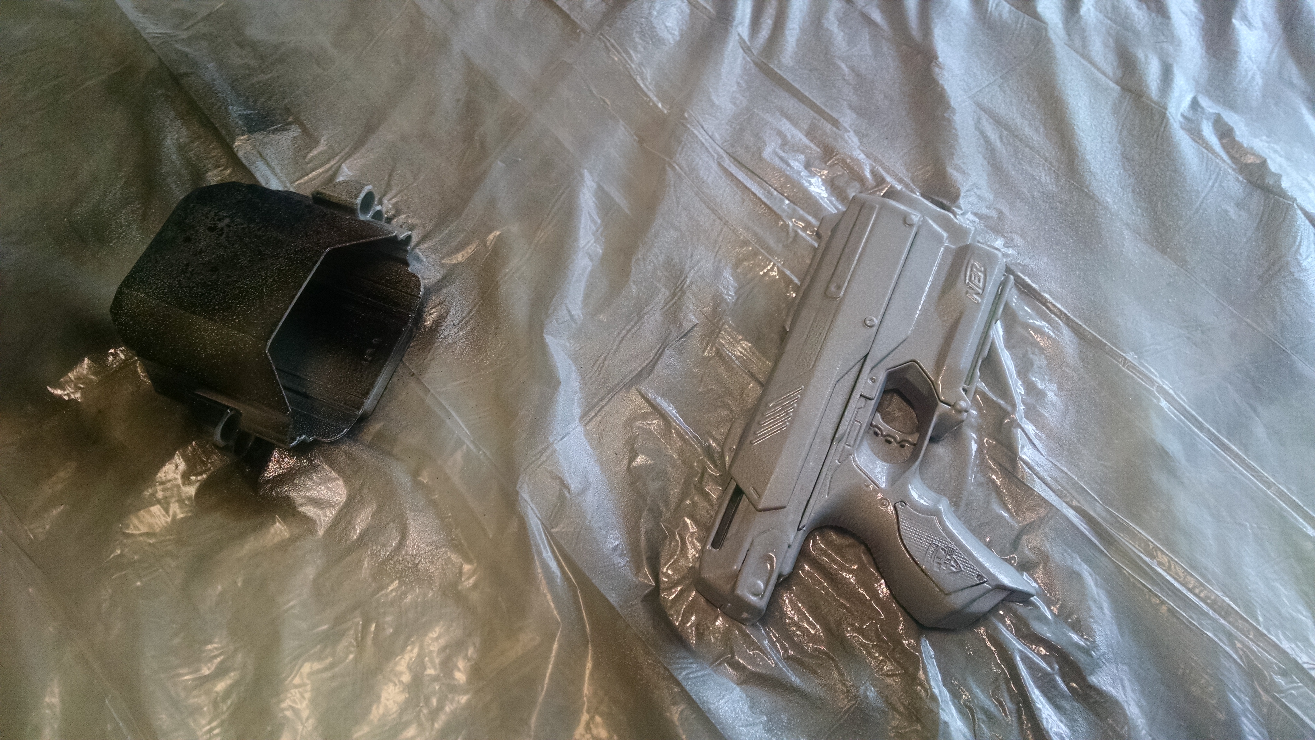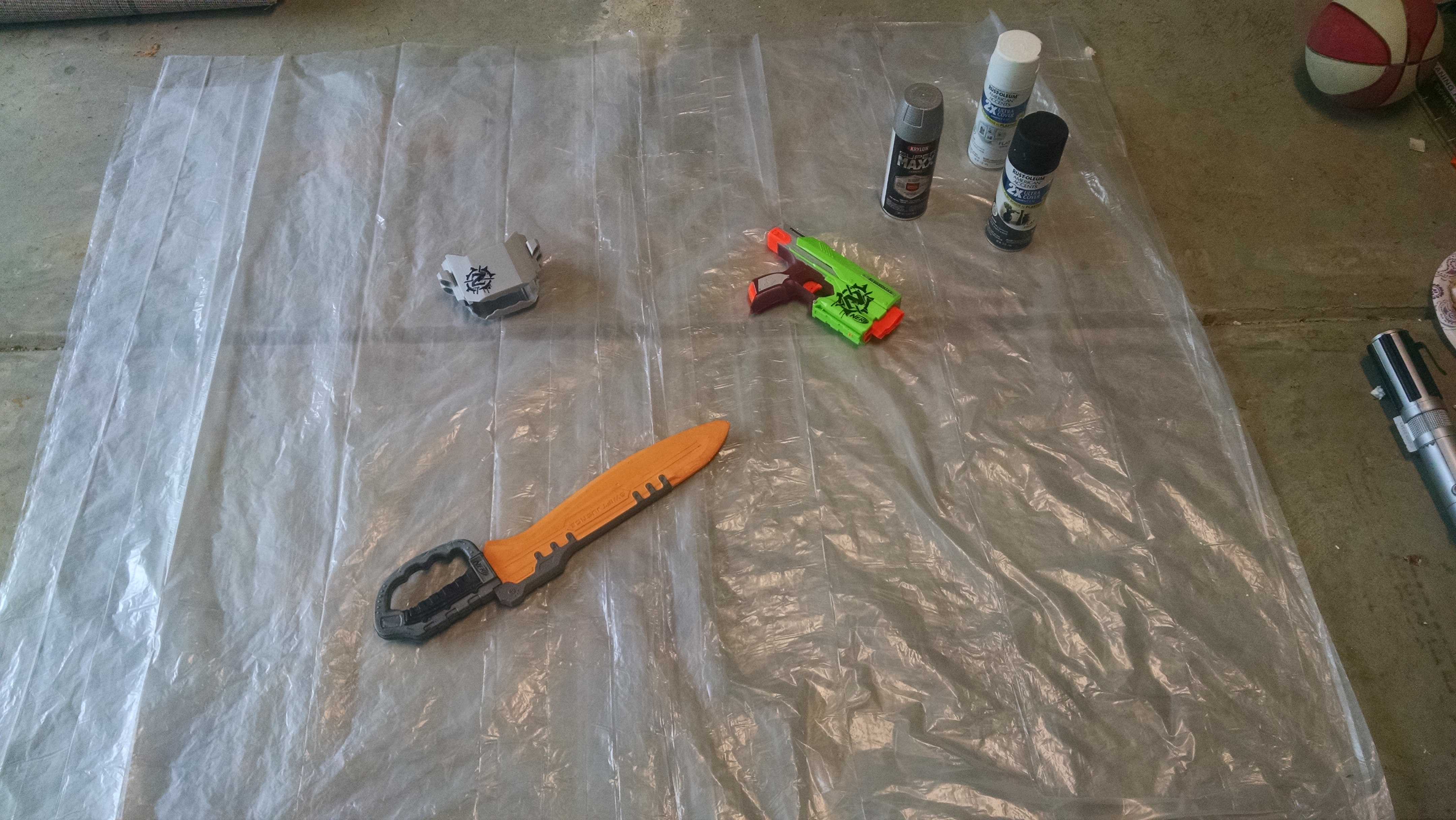 The next thing I worked on was converting a Zombie Hunter Nerf gun and short sword into something that a Destiny Hunter might carry. For this, I used the same silver grey spray paint that I’d used on the cloak and also a matte black spray paint. Because both items are plastic and foam, and fairly bright colored, it took several layers. I covered them both completely in the silver, then spot sprayed them with the black. I felt like this would give the props a more “burnt metal” look.