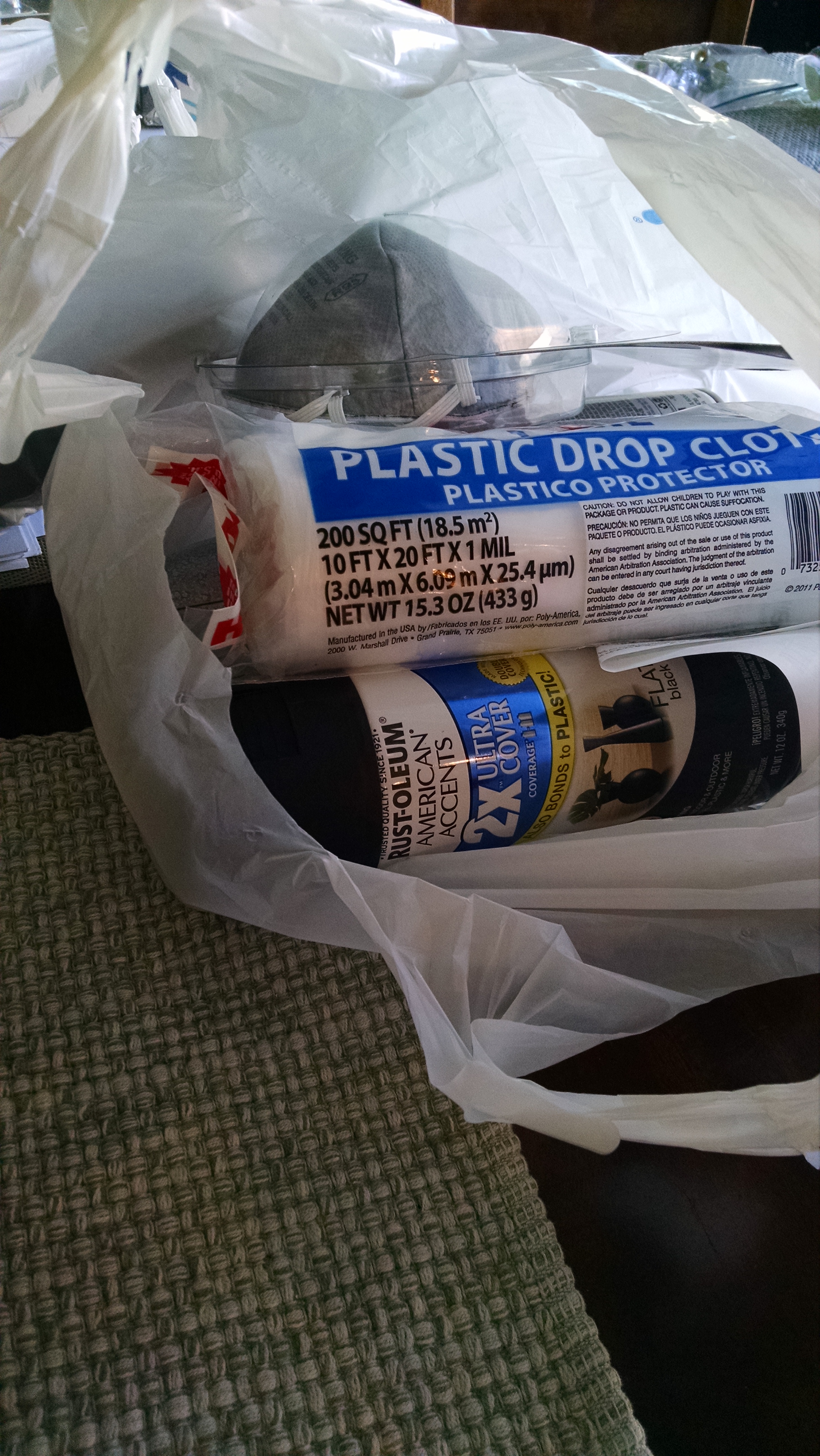 After digging through some boxes in the attic, I found an old ski mask to use as a base. Perfect. It covered his eyes, but not in a way that would make him uncomfortable. Then I took a trip to Home Depot and bought a paint fumes mask and a bunch of Superglue. (FYI, Superglue dries really fast. So don’t, uhh, get it on your fingers and then grab the tube again. Learn from my mistakes, friend.) I covered the mask’s clear plastic with paper, then spray painted the logos on the headband and the fumes mask with the matte black paint. Because of the material I was painting, it took two coats.
