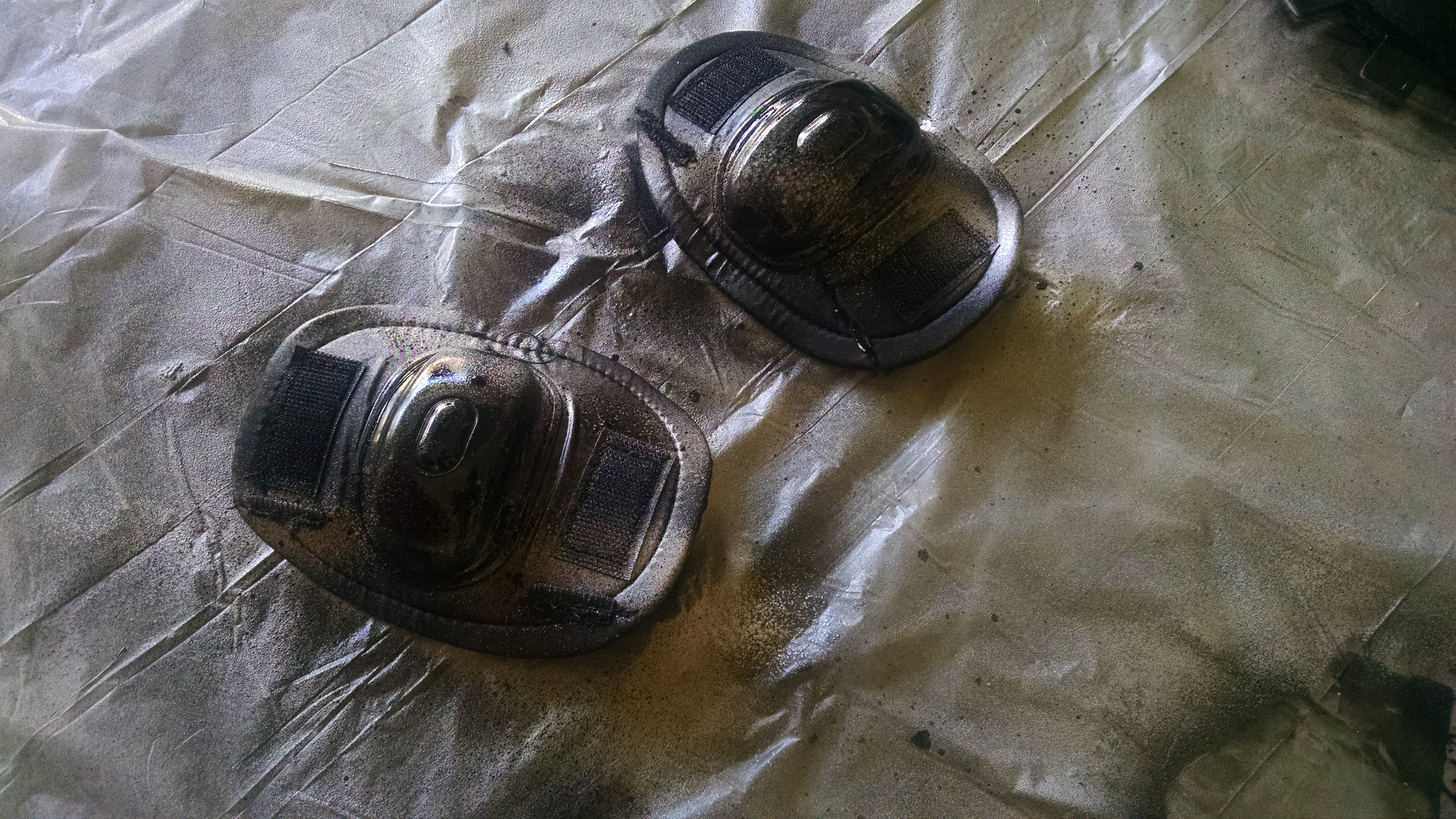 Using leftover cardboard from the toy gun and knife packaging, I fashioned pieces to glue onto the mask to make it look more like a Hunter’s mask. You can get creative here, since there are so many variations in the game. Once I put together what I wanted, I brought those out to the garage and spray painted them as well. Let me add here, you should be wearing your own fumes mask while doing any painting and always in a well ventilated area.