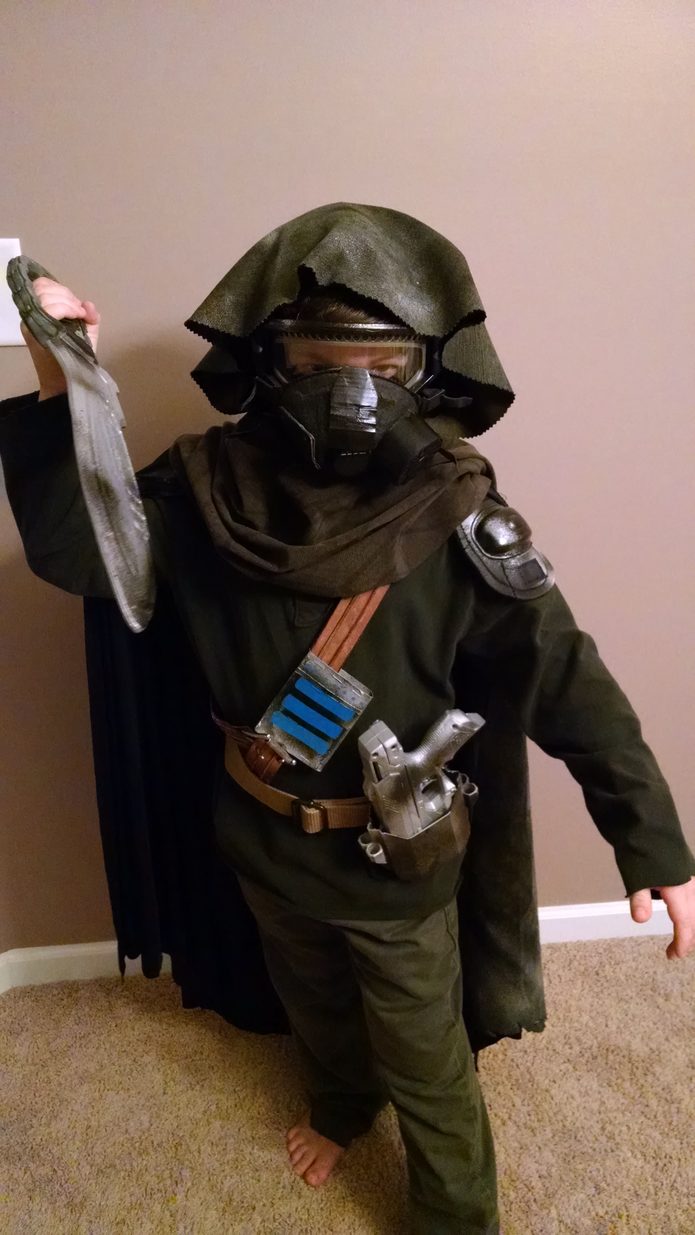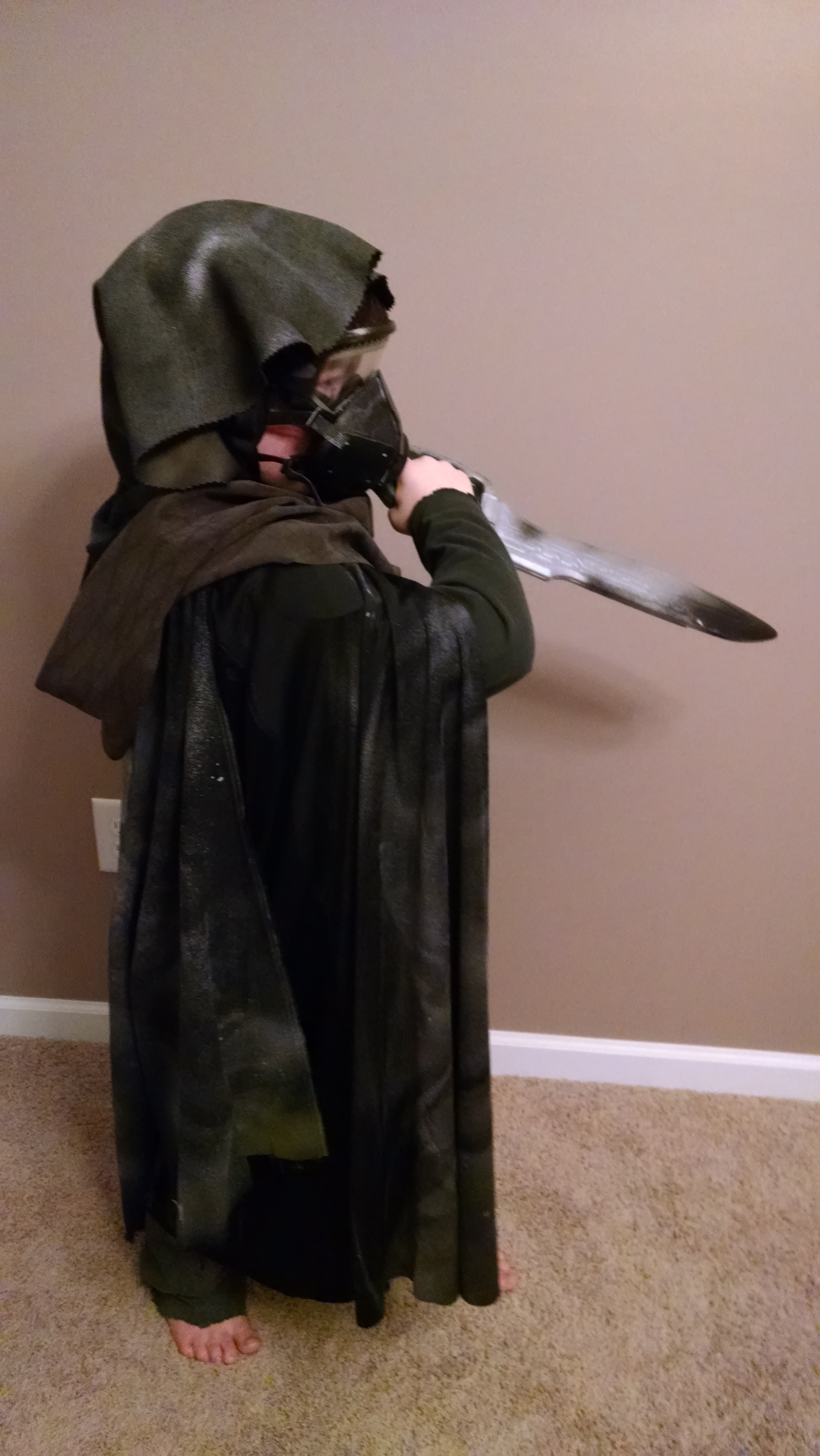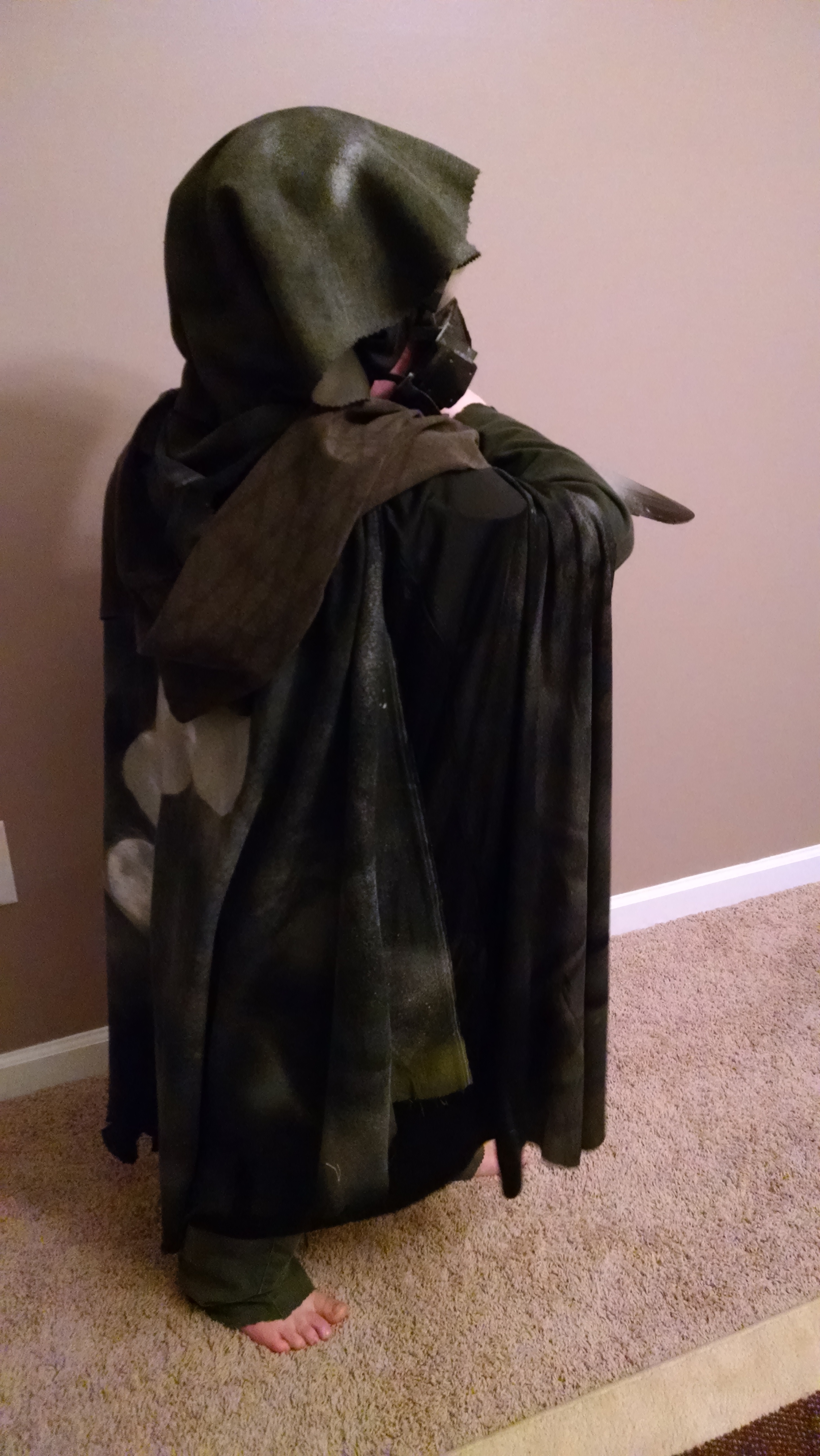 At a local Goodwill, I found greenish-grey jeans and a dark green long sleeved shirt. Both were too big for my nine-year-old, but that worked in my favor, actually. Cutting the sleeves and pant legs only added to the ragged look of the costume. For some extra armor, I took the Velcro and the straps off some skateboarding safety pads, spray painted them, and sewed them to the shoulders of the shirt. You can’t see them much under the cloak, but they give bulk and lift to the shoulder area. Add a couple old belts (leather works best, but I also used a material one), to harness the power pack and gun holster, and the costume is almost complete.