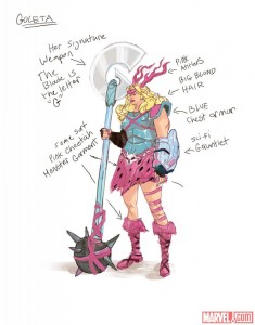Also, in this interview with del Mundo, he shares the character artwork for a character named Goleta, described as “a tall, strong, full figured Viking woman with Marilyn Monroe hair,” who I want to cosplay immediately.