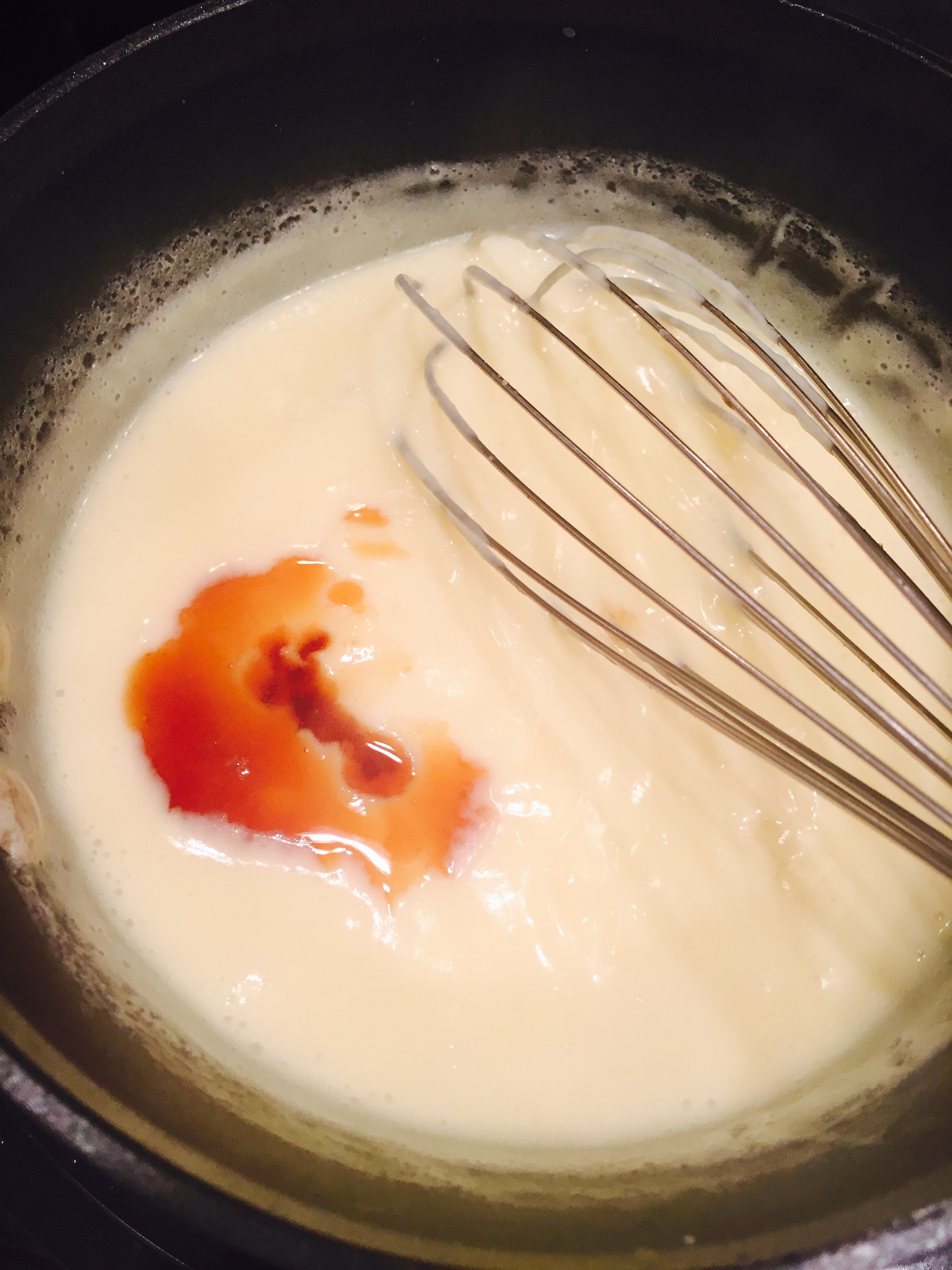 When all the milk has been added to the eggs, pour everything back into the saucepan. Set the pan back over medium heat. Whisk constantly until cream begins to thicken.