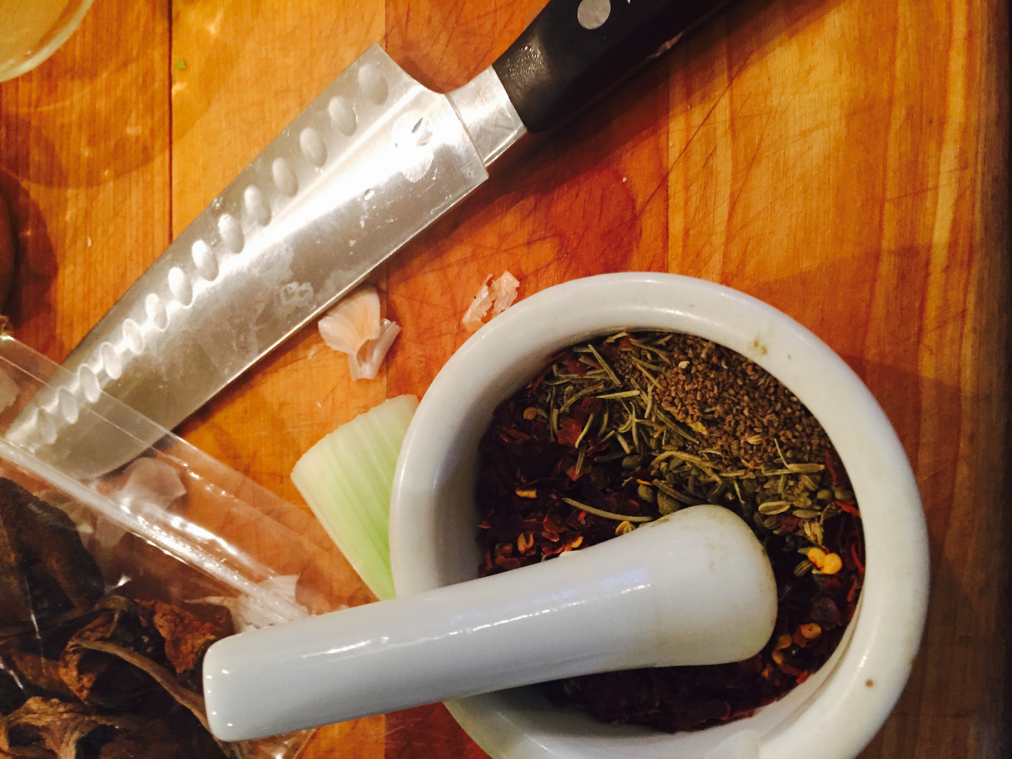 Step one: Melt the butter in a large saucepan. When it is foamy, add the diced onion and celery, saute until soft and fragrant. Meanwhile, grind the herbs to a mortar and pestle (or in a coffee grinder). When aromatics are soft and the onion is translucent, add the herbs, pepper, salt, broth, clam juice, tomato paste, and beer. Slice a lemon in half and add directly to the broth. Stir to combine, bring to a boil, and turn down the heat to simmer for 1-3 hours.