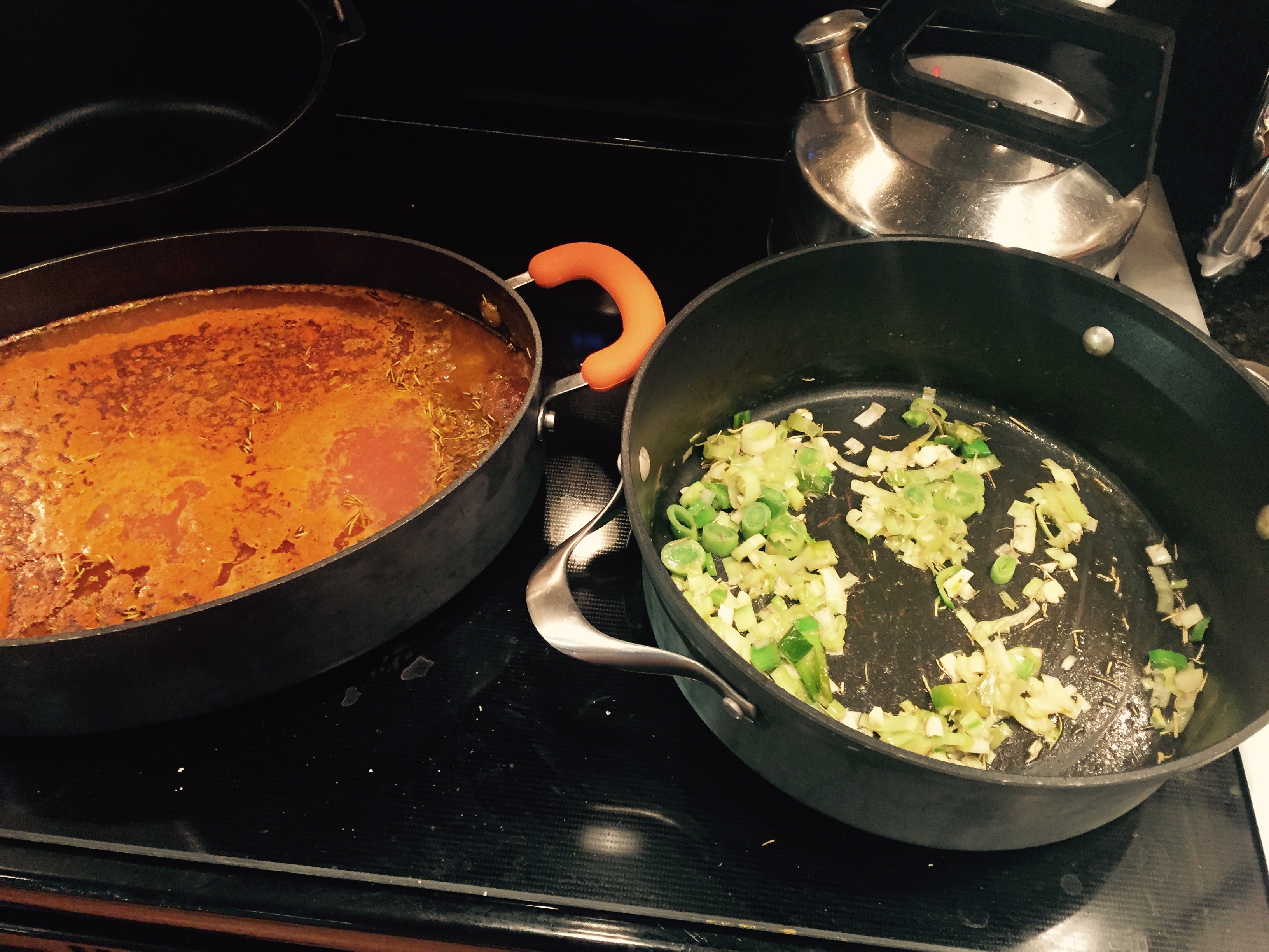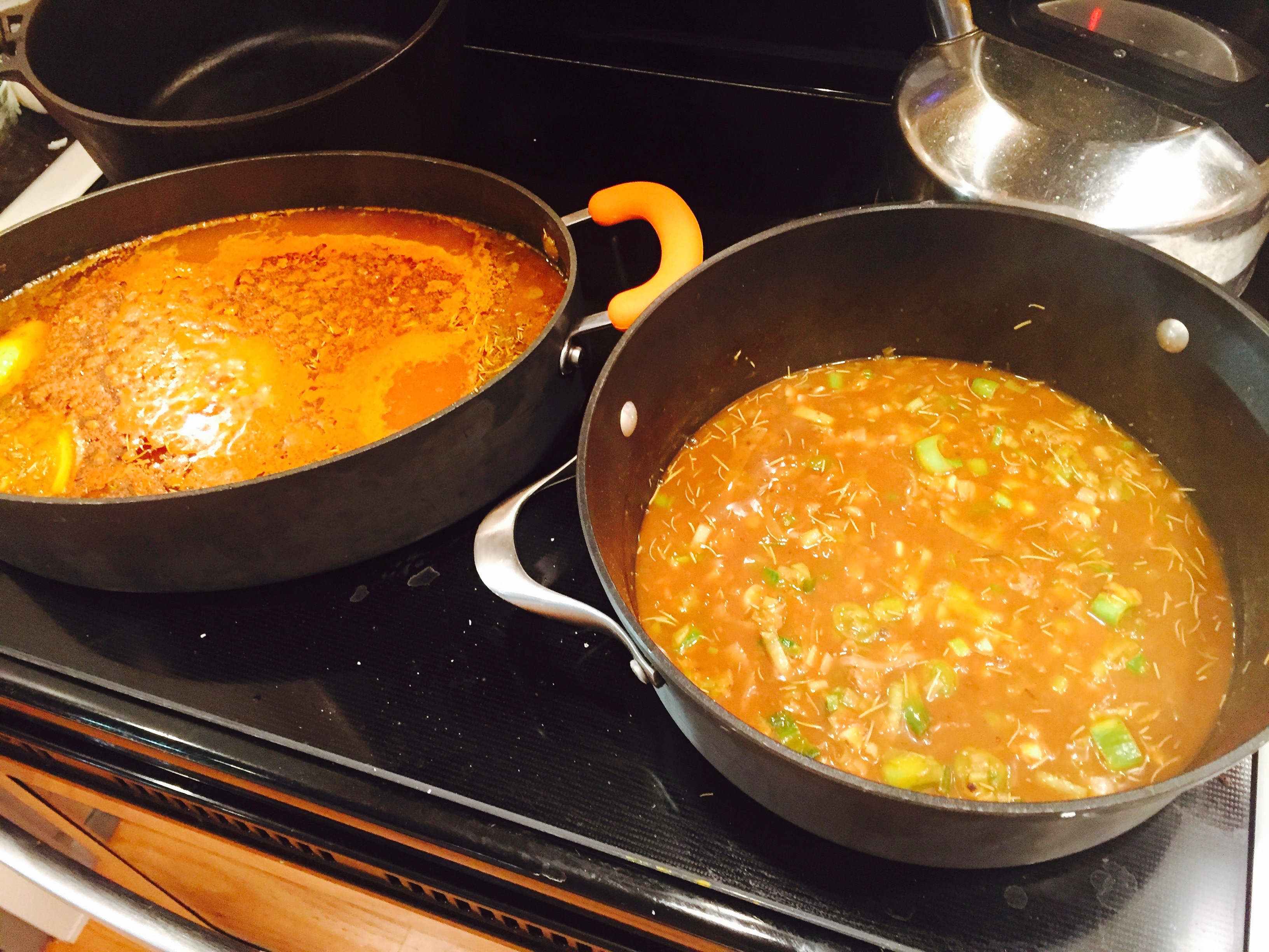A Cajun recipe, Killer Shrimp consists of a rich broth, simmered slowly on a stovetop, and finished with a pile of shell-on shrimp. It’s eaten with crusty bread, and, I may say, is incredible as leftovers when finished with a little heavy cream and mixed into linguini, or simmered with mussels.