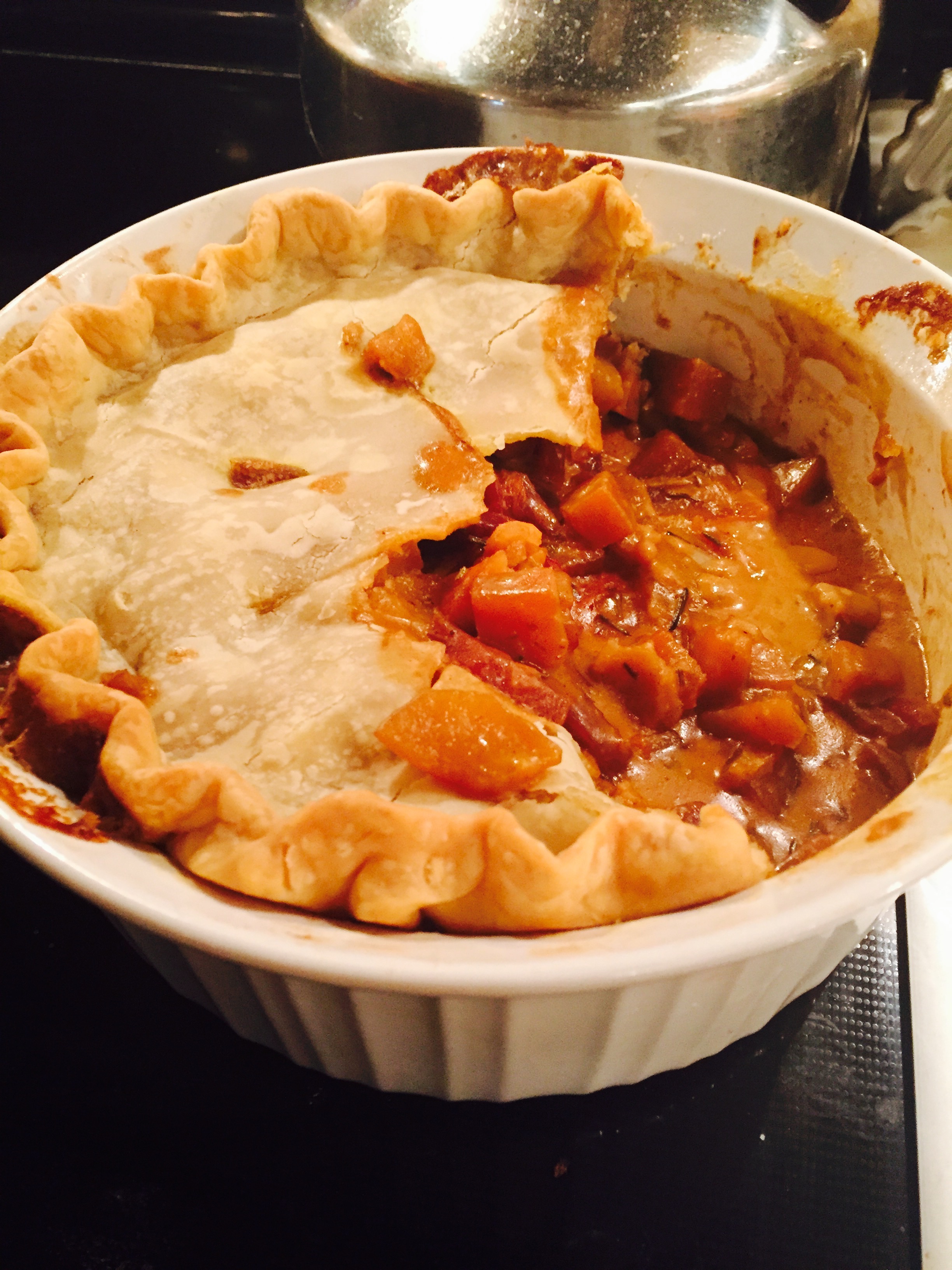 Pour the filling into a deep casserole dish, and top with the pie crust. Crimp around the edges and cut vents into the crust. Bake for about half an hour, or until crust is golden brown around the edges. Serve with a side of homemade cranberry sauce, and a dark brown beer.