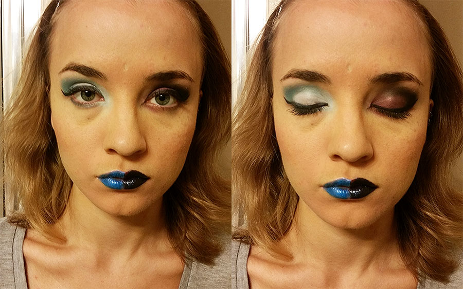 For this look I actually called on the help of my friend and roommate. This was her “light side” Star Wars. I colored her crease first with the Jumbo Eye Pencil in “Electric Blue,” then colored her lid with “Milk.” I blended it all together before creating a line across her lip with the gel liner. I went over that line with the liquid liner. Finally, I added House of Beauty’s Lip Hybrid “Bayside” to her lips. See below.