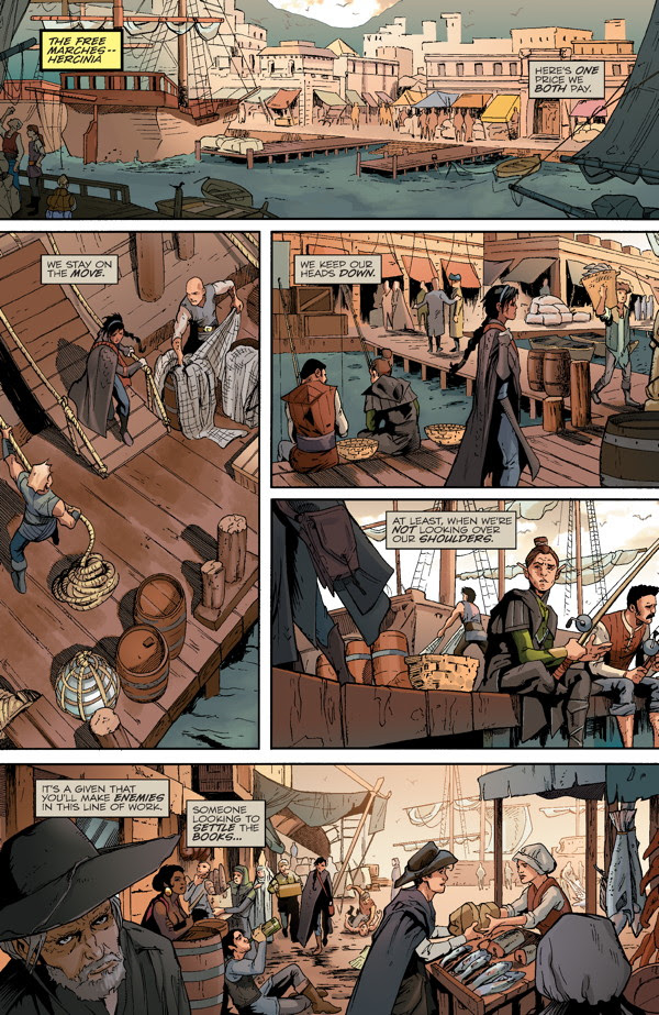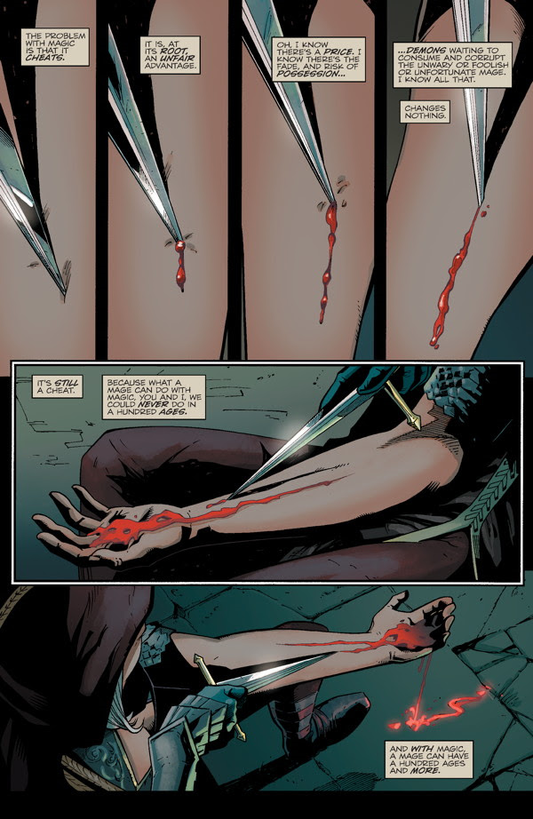 I’m fangirling a bit, of course, and my obsession with all things BioWare is certainly colouring my review, but I feel that I can step back enough to agree with Dark Horse’s assessment that this is a good place for any dark fantasy fans to step into the world of Dragon Age without feeling lost. While the locales are familiar to fans of the game, we have yet to meet any of the familiar faces that populate the game lore, so the characters are just as new to me here as they would be to a newcomer. Moreover, Rucka’s story quickly ventures off to Tevinter, a place fans have heard much about, but have rarely seen in play. It is also a place that Marius has refused to return to, but dark circumstances have forced his hand, which is where the plot twists nicely to hook you in for the next issue.