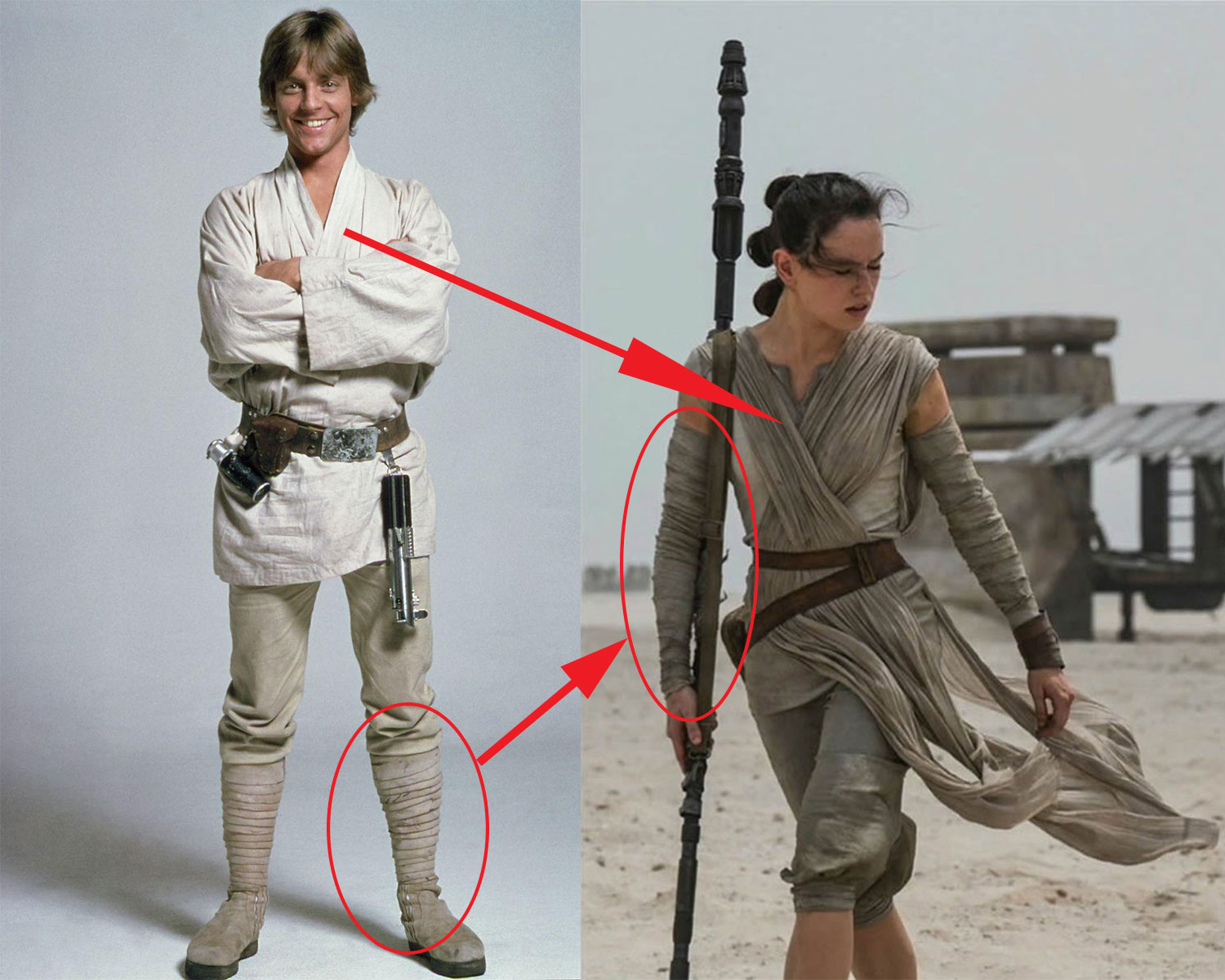 This is chic working gal—of the kind that Furstenberg caters to. The silhouette is very similar to Rey’s (which is very similar to Luke’s—see the side-by-side comparison from VanityFair.com). Then there’s the 1970s feel to this jumpsuit that I adore. It references the era when the first film debuted, when we got an ass-kicking princess in the form of Princess Leia, but who eventually came to be largely represented in Star Wars fashion and merchandise by a slave bikini she wore for only a brief time in one of the three original films. Furstenberg’s is a powerful woman who doesn’t reject a feminine aesthetic—much like Carrie Fisher, who requested an aesthetic change, which resulted in the slave bikini because she wanted to be perceived as womanly, but also coached Daisy Ridley with, “Don’t be a slave like I was … keep fighting against that slave outfit.”