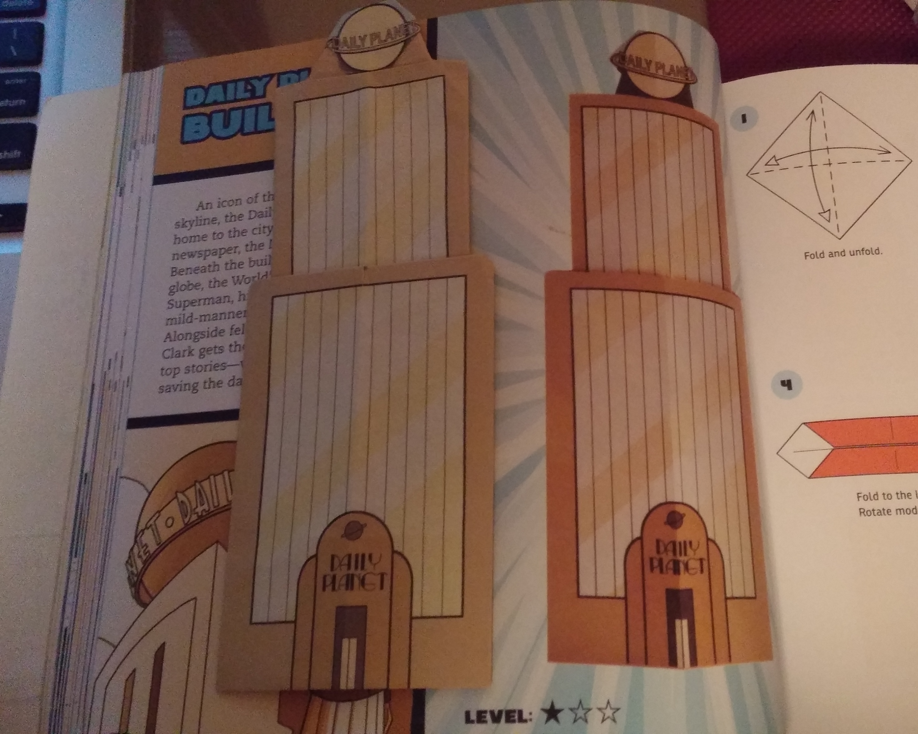 Out of the 46 designs in this book, I’ve tried 33 of them, and I’ve done so multiple times for most of them. The back of the book contains origami paper with the required designs. There are a few copies of the same design, allowing you to try the design repeatedly, as well as a table of contents to help you find your desired character/object (Batman’s Batcycle, Wonder Woman’s Invisible Jet, Lex Luthor, etc.). According to the book’s introduction, “The diagrams…are drawn in the internationally approved Randlett-Yoshizawa style,” and there is a rundown of symbols for what the different lines mean (e.g. fold in front vs fold behind). The beginning of the book, just after the table contents and introduction, let’s you practice the different types of folds such as the squash fold, petal fold, etc. until you feel comfortable enough to tackle the rest of the book.