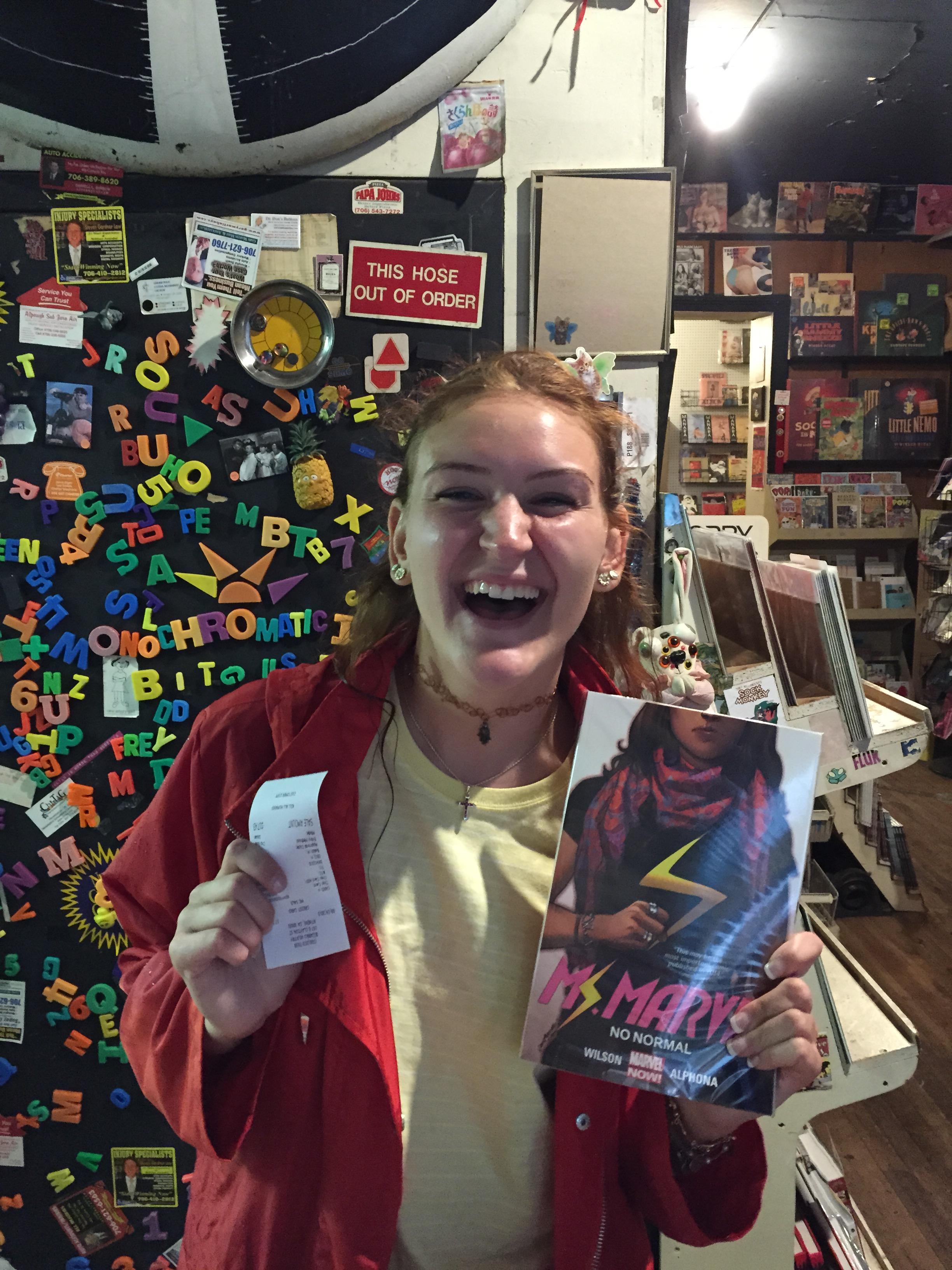 Instead of having them buy Ms. Marvel at the campus bookstore, I offered extra credit for students who trekked the two blocks to the local comic book store. Comics are community! Comics are connection! They should be purchased in a store wallpapered with Spider-Man posters and surrounded by likeminded readers! Soon pictures of students taking selfies while clutching their comics to their chest came pouring in. However, the pictures looked odd. Sure, they were smiling, but it seemed to be the smile of a hostage that has a gun pointed at them just off camera.