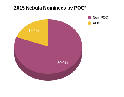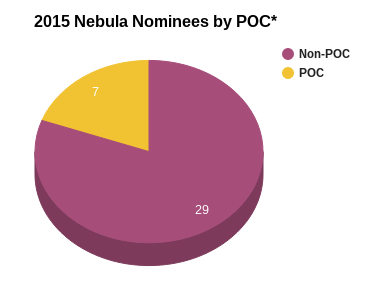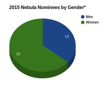 Of the six categories with nominees announced, let’s look at five of them (Novel, Novella, Novelette, Short Story, and the Andre Norton Award for Young Adult Science Fiction and Fantasy) together. Of the 36 nominees, 23 were women and seven were people of color (POC).