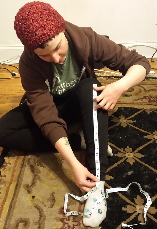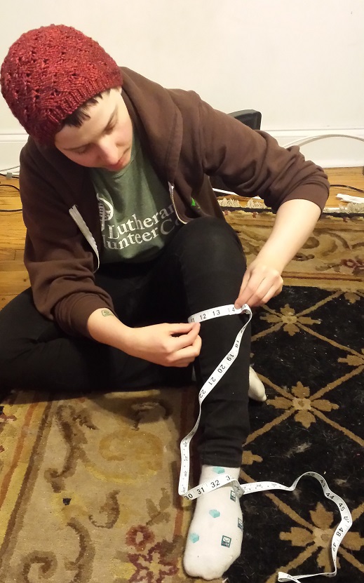 The leg is the part that involves math and swatching, because the gauge in inches is very, very important, since that’s also how you measure your ankle, the widest part of your calf, and your lower leg between your ankle and your knee. The pattern is made for a plus size leg and will need to be sized down for straight sized people, and because I’m awesome, the lovely Alenka modeled how to measure these for you because I told her I wanted a straight sized person for comparison purposes and not at all because I secretly am knitting her a birthday present.