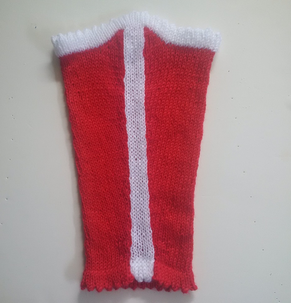 Fold over the top picot edge and handstitch the cast on edge to the fabric. I use the white loops on the color change row for the seam. And that’s it! Your legwarmer/bootliner is now finished!