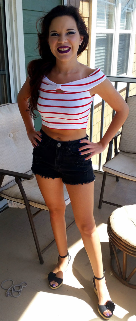 I add my lipstick, and then I start building my Frankie Charles inspired outfit. She’s wearing a stripped red shirt and a bodycon black skirt. Frankie often wears lots of high-waisted clothes, which are right up my alley. I don’t have a black high waisted skirt (unfortunately), but I do have a pair of high-waisted shorts and a pair of strappy wedges, which I noticed the women in Batgirl of Burnside tend to wear a lot.