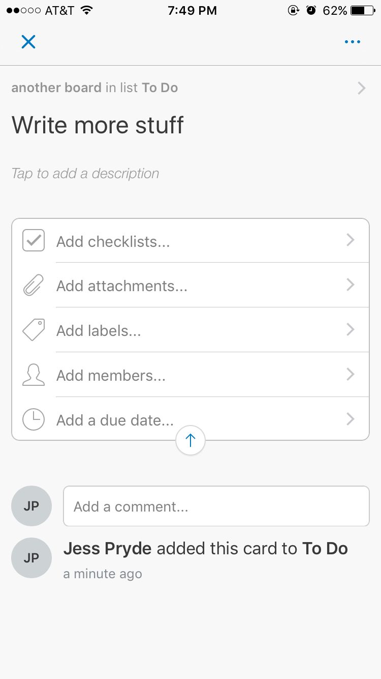 So how does it work? Easy. You get an account, and you start with a welcome board. Add boards by selecting “create new board” on the desktop or the + on the app and give them names. Once you have a board, you can add a list, which is where you place cards about like items. Once you’ve got your basic text (“milk”), you can add anything to it: text, a link, an image or other attachment, or an emoji. You can create a checklist or give it a due date. You can create a labeling/color coding system and utilize that, too. When you’re ready to take something off your list, you can either drag it up to the top (on your phone) or archive it (in desktop mode). You can even move it to another board. It can be as simple or as complicated as you want it to be.