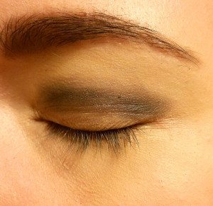 The first thing I do is lightly brush black eyeshadow into the crease of my lid. I use ELF’s Contour brush from their Studio brush line and black shadow from NYX’s Smokey palette. I’m always very careful when using black eyeshadow. It can be very messy and hard to clean up if you’re not careful. It’s easier to go back and put more eyeshadow on than it is to go back and take it off.