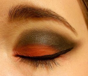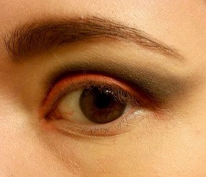 After I carefully brush into my crease, I add red eyeshadow using Geek Chic Cosmestic’s N7 and pat it on my eyelid. Then using a fluffy brush—I use ECO Tool’s Duo brush—I carefully start blending out the black eyeshadow. I had to dip my brush into the black shadow a few times because, again, I’m very cautious with how much I use. I pat the shadow on first as a guideline of what I want it to be, then sweep the brush back and forth over the crease of my eyelid. The result is this:
