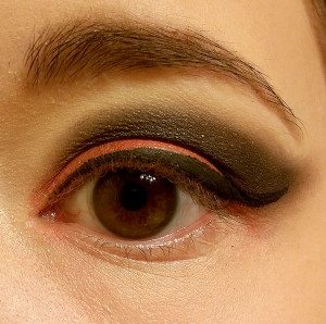 Now, I break out the eyeliner. For this look, I think you could use a pencil liner for a better effect since black pencil liners smudge really well. I used a liquid liner instead from Walgreen’s Wonder Woman collection. I don’t use the applicator that comes with the tube; I use my ELF Eyeliner brush from their Studio collection. It has a bent tip, which helps contour to your eye better and gives me more control over where my liquid liner goes.