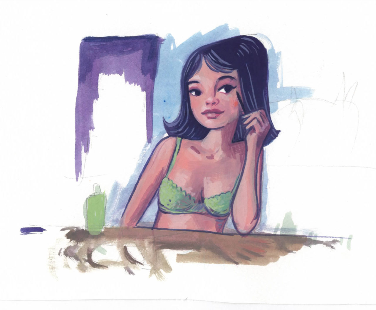 I gave Jenny a basic idea of the illustrations I wanted her to do to get us going for the Kickstarter campaign and really, she just took it from there. She provided me with initial sketches (some were painted pieces) and once I gave her the okay, she finalized them in a vector style. Before creating the cover, we had an in-person meeting and Jenny went through my romance comic collection so she could really get a feel for the right look for the cover. Jenny’s vision for the book is so in line with mine that she has honestly been a breeze to work with. As I mention on the Kickstarter page, while the writing and editing tasks are complete, a large portion of the money raised will go to Jenny to finish the illustration and design work. Working with Jenny has been fantastic and I really hope that the project is funded and we can continue our partnership working on the book.