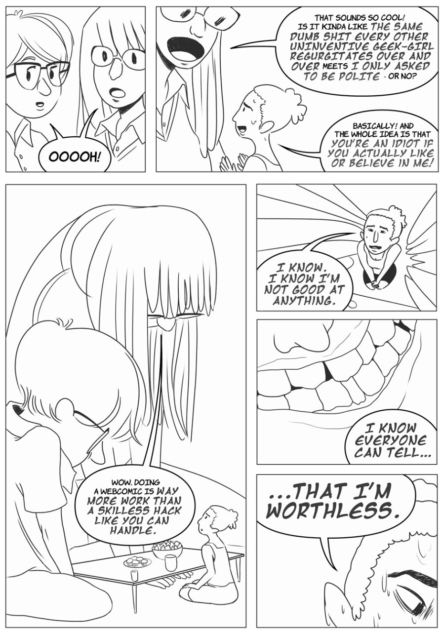 Sage: It was hard sometimes and easy others! I feel like that comes along with any project, though. We wanted to make sure if it was a 12 page story, it needed all 12 pages. Some situations are just too complicated to explain in the typical 1-3 pages. Others find the lower page count fits their experience perfectly! It’s important to have a wider page range for such a different array of experiences.