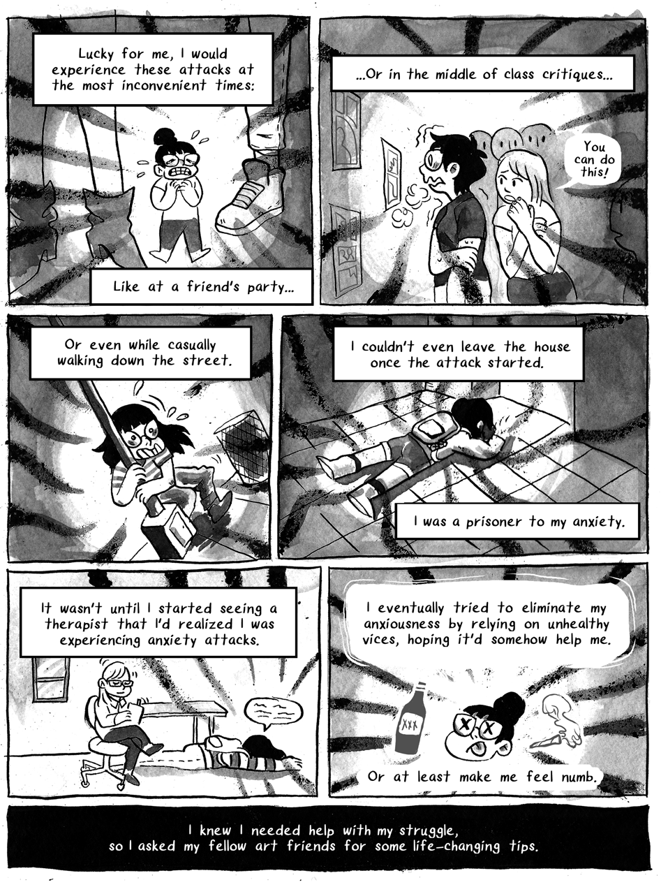 Another inspiration for the initial idea to make an anthology about anxiety was my own experience with it. I had ignored my depression and would try to be as outwardly happy as possible. I’d say, I’m still a naturally upbeat person and come off as such, but ignoring those feelings back then was really unhealthy. I started doing autobio comics later as a therapy to help me process my feelings and express those negative thoughts in a healthy way! One of the big goals we have for this anthology is to offer a safe place for others to do the same.