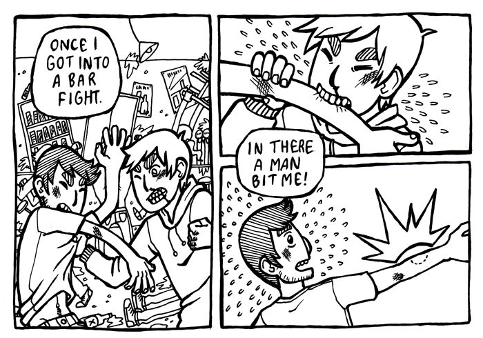 Start Over Again is a collection of short comics that range from humorously tongue-in-cheek to dark and disturbing. The zine opens with several sweet, funny and feminist comics that are tonally reminiscent of Lehkonen’s webcomic, The Immortal Nerd. Women discover that, without chivalry, their day-to-day lives become difficult, a new dog-owner experiences a strange, emotional loss, and a broken arm helps one person discover their inner hero. While many of these stories also highlight Lehkonen’s fabulous color sense—“Dog Shelter” features some gorgeously watercolored city scenes—one of the standouts is the black and white “Incredible Man-Man,” starring a guy named Guy, an ordinary man who once got in a bar fight, and had an experience that pokes fun at stereotypes of masculinity.