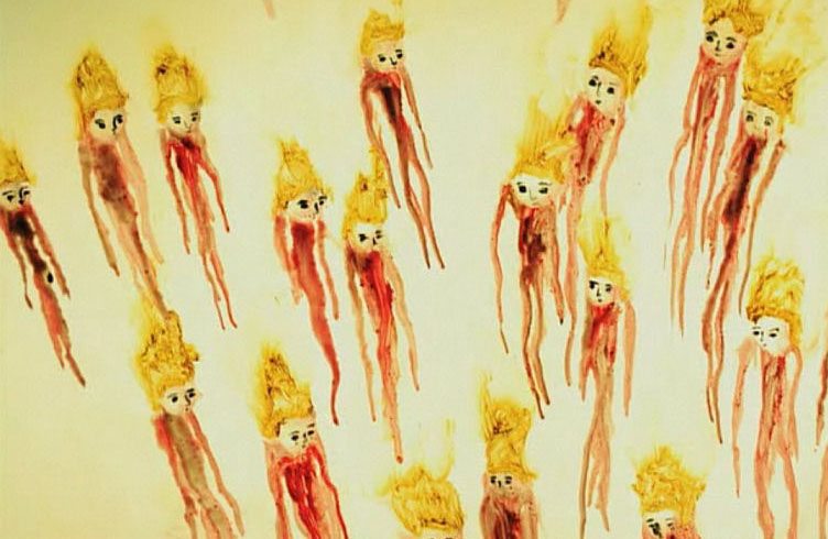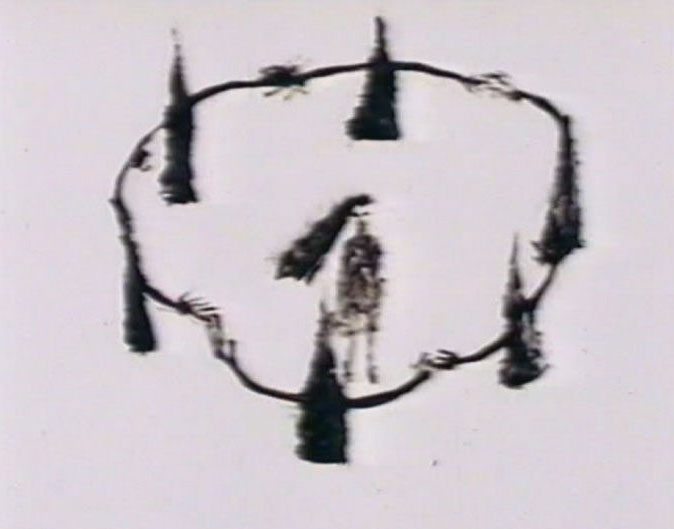 The film is often unsettling. This is partly due to its use of sound–the eerie whistle of blowing wind plays through much of it, while other noises are used as abrupt punctuation–and also because of Freeman’s weird, ambiguous imagery. At one point, the girl is surrounded by a ring of triangular figures with long, clawed arms, halfway between anthropomorphised trees and hooded cultists; they reach out and tear off her clothes. At the same time, however, the girl shows a degree of control over this nightmarish imagery, as when she apparently causes the triangular creatures to burn away to nothing.