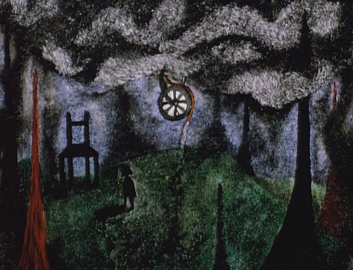 But Freeman’s technique is more refined than in her student film. The Mill shows a better balance between the consistent and the amorphous. Evocative landscapes of fields, trees, and dark-clouded skies form from the shifting paint, before playing host to surreal transformations. Faces and hands periodically appear on previously inanimate objects, ready to act as guides for the girl, only to guide her right into another bewildering situation. The girl encounters a dreamlike distortion of space as he makes her way through her shifting environment.