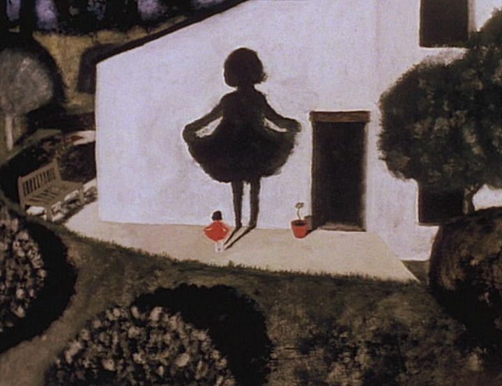 But despite making use of such otherworldly imagery, Jumping Joan is, on the whole, a more naturalistic film than The Mill. Freeman’s character animation is more refined, with the girl’s smaller movements–brushing her hair from her face, skipping as she walks–being convincingly lifelike. The film shows a sharper eye for finding the fantastic in the everyday: translucent curtains billow like ghosts, while the girl plays with her enormous shadow as it appears on the wall of her house, prefiguring the silhouette-creatures that she later creates.