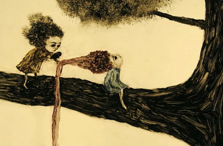At the start of the film, a little girl–who, in clothes and hair, closely resembles Freeman’s animated heroines–plays with toys and found objects in a garden shed. In the kind of spatial distortion turns up throughout Freeman’s work, the shed contains a doorway that somehow leads to a small clearing in a wood; here, the girl comes across a stuffed replica of the bee-child from The Mill. Accompanying her are two toy bunnies, animated in stop motion, which echo the two rabbit-like figures in Jumping Joan. An oddly-proportioned beekeeper–another image from The Mill–appears and tugs the bee boy from the girl’s arms before storming away. The girl follows and finds the bee boy being forced to operate a strange machine; once again, Freeman appears to be recalling the mills from her childhood. The girl rescues him and takes him back home.